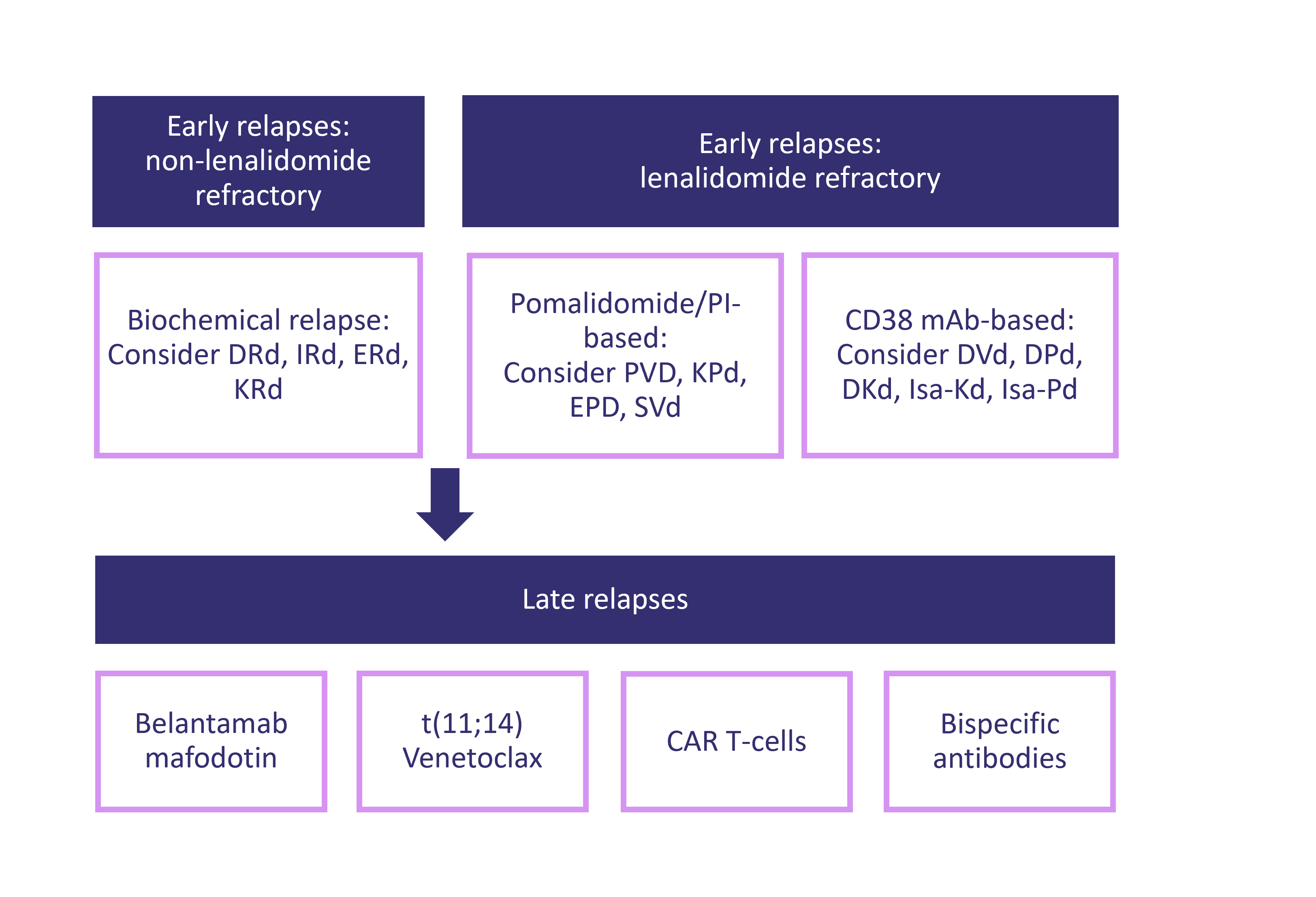 For the purposes of the study, early relapse is defined as first or second relapse. Patients who relapse after one or two treatment regimens still have many alternative therapies compared with patients with more advanced MM. When evaluating treatment options for relapsed MM (Figure 1), there are at least five key considerations to take into account2: