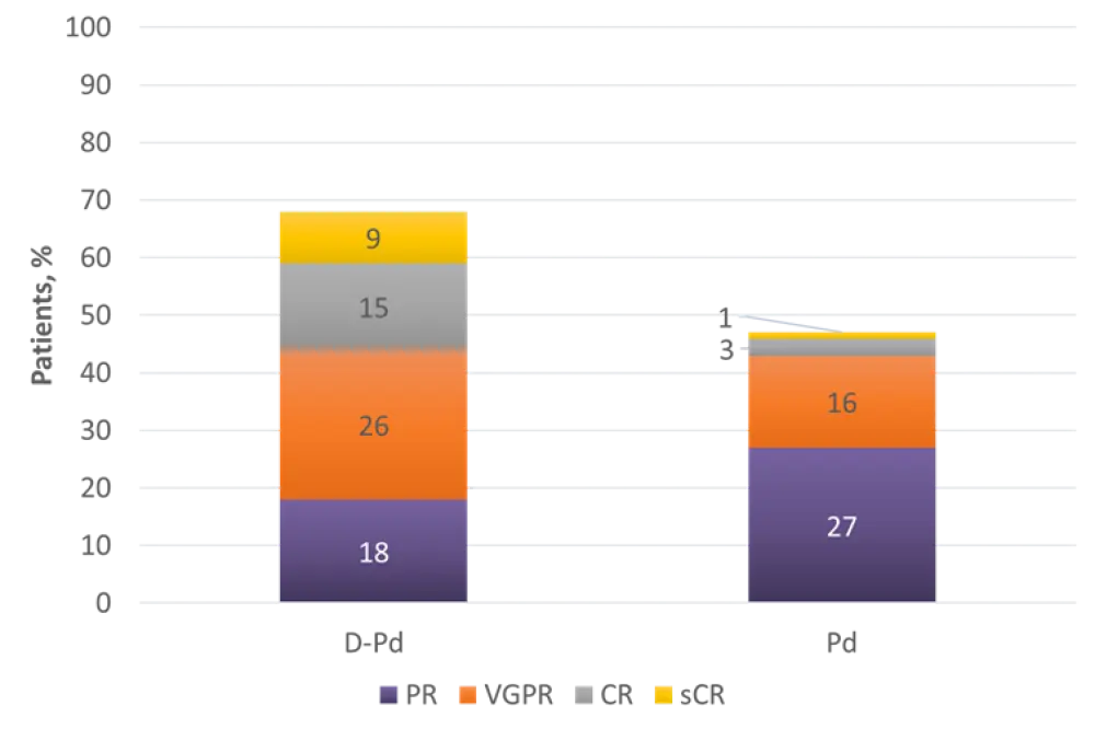 CR, complete response; D-Pd, daratumumab, pomalidomide, and dexamethasone; Pd, pomalidomide and dexamethasone; PR, partial response; sCR, stringent complete response; VGPR, very good partial response.