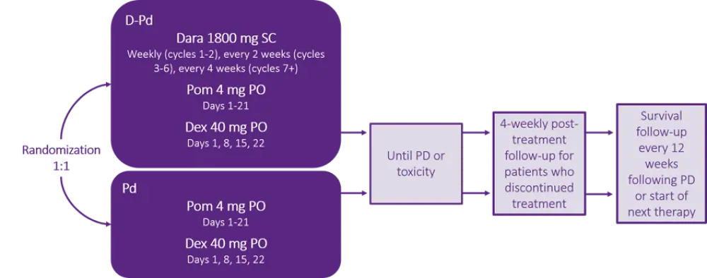 D-Pd, daratumumab, pomalidomide, and dexamethasone; Dara, daratumumab; Dex, dexamethasone; Pd, pomalidomide and dexamethasone; PD, progressive disease; PO, oral; Pom, pomalidomide; SC, subcutaneous.