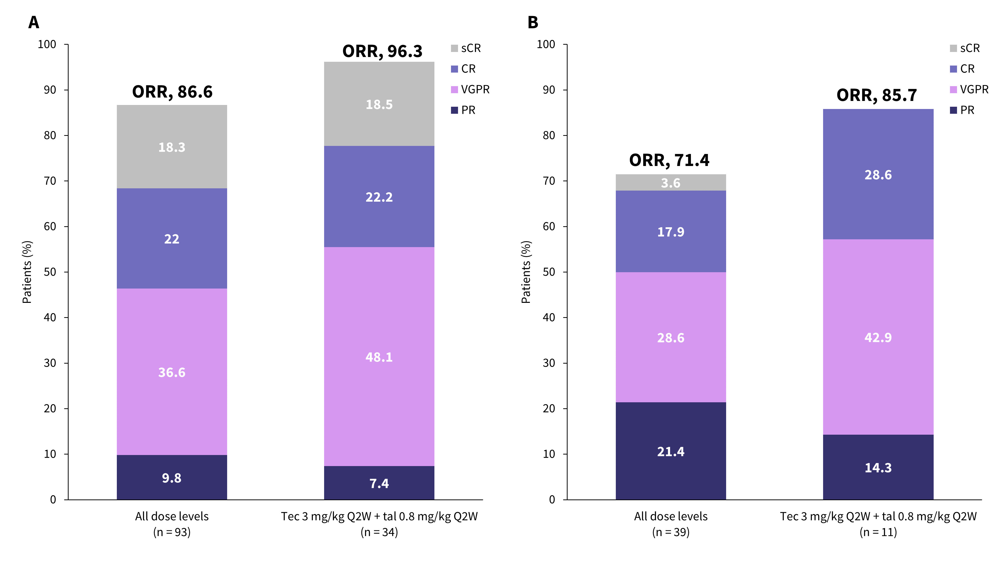 CR, complete response; PR, partial response; Q2W, once every 2 weeks; sCR, stringent complete response; tal, talquetamab; tec, teclistamab; VGPR, very good partial response.