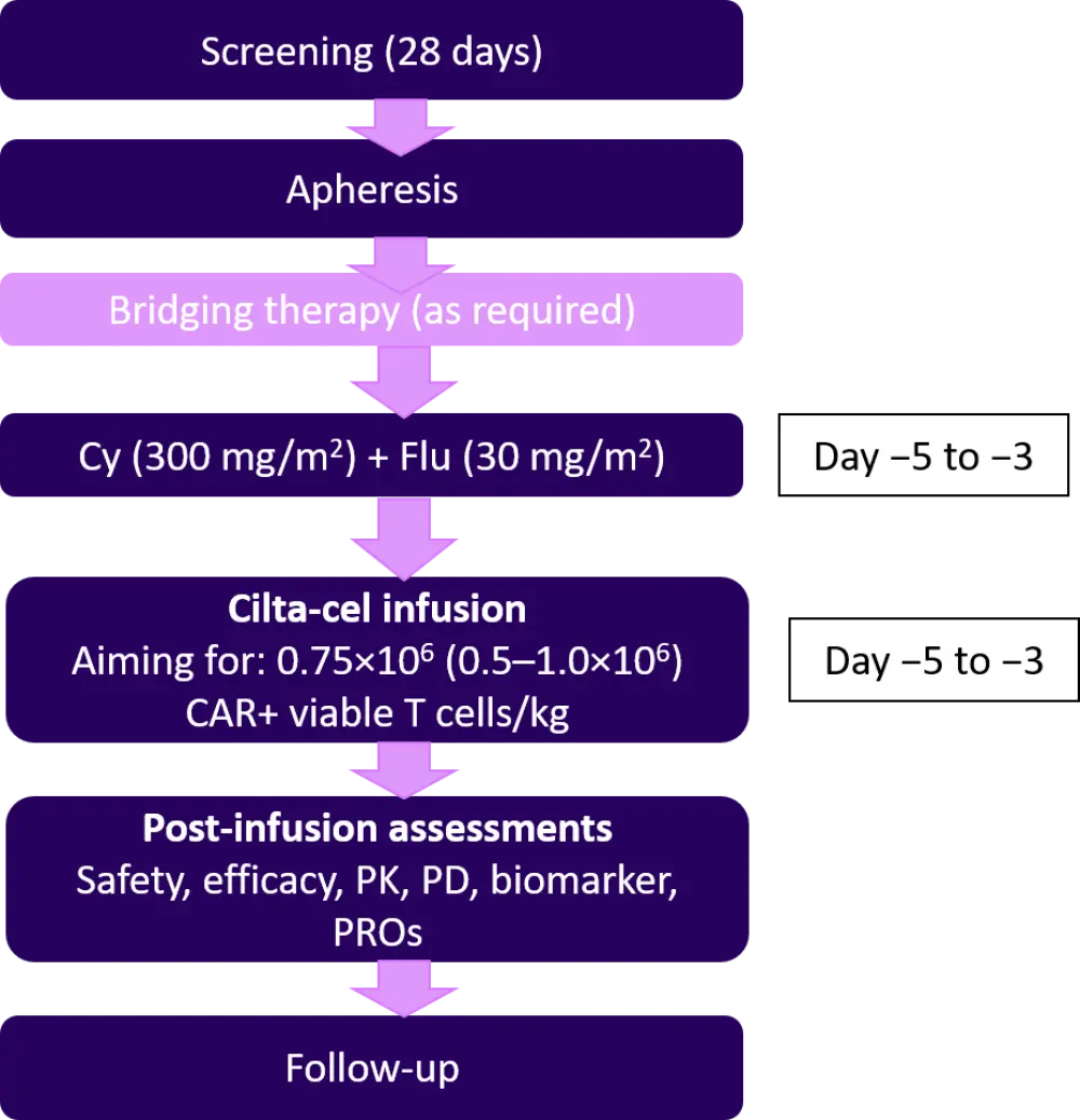 CAR, chimeric antigen receptor; cilta-cel, ciltacabtagene autoleucel; Cy, cyclophosphamide; Flu, fludarabine; PD, pharmacodynamics; PK, pharmacokinetics; PRO, patient-reported outcome.
