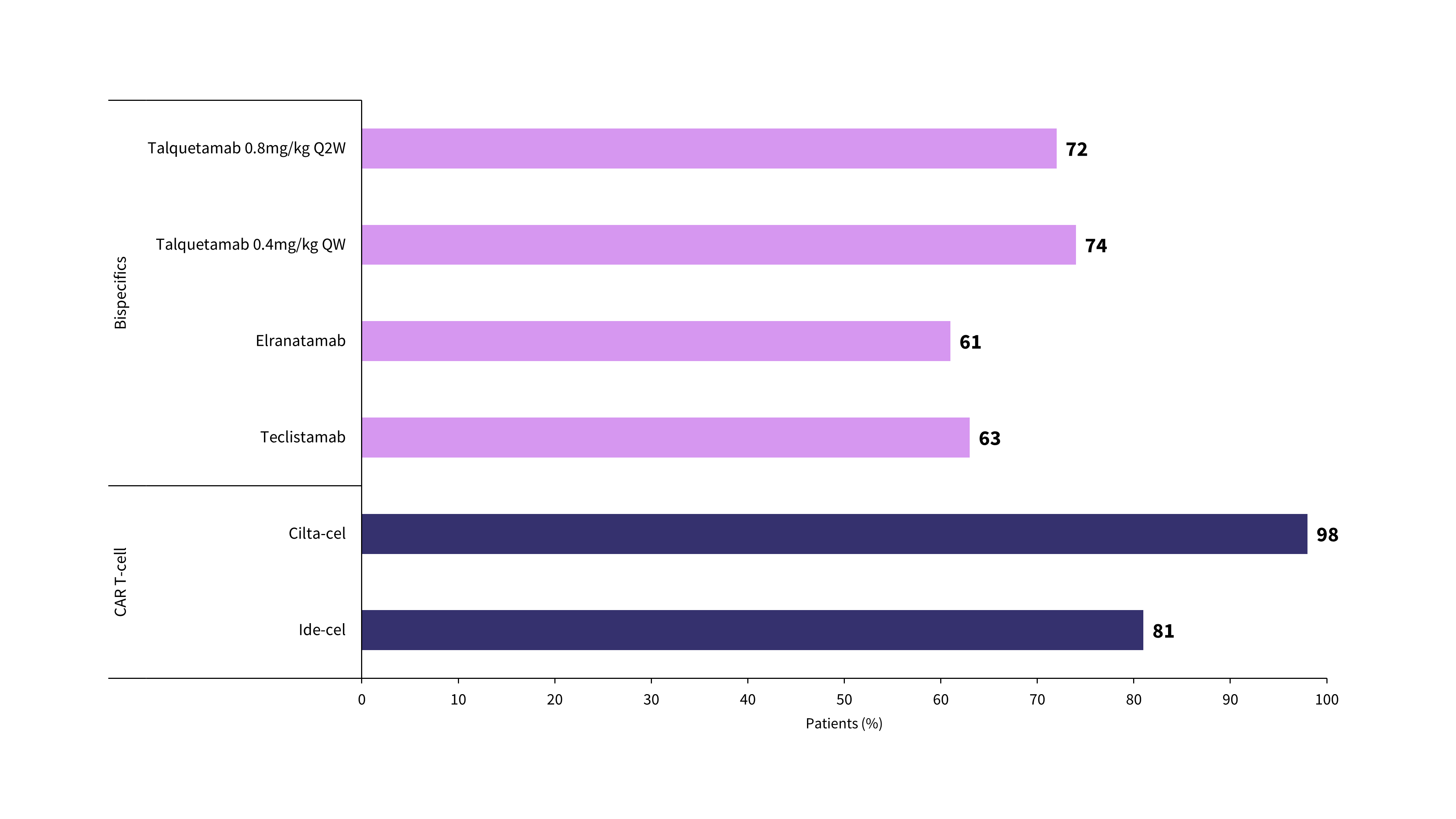 Both CAR T-cells and bispecific antibody therapies yield high response rates in patients, with CAR T-cells being particularly effective at eliciting a response in the heavily pretreated population.