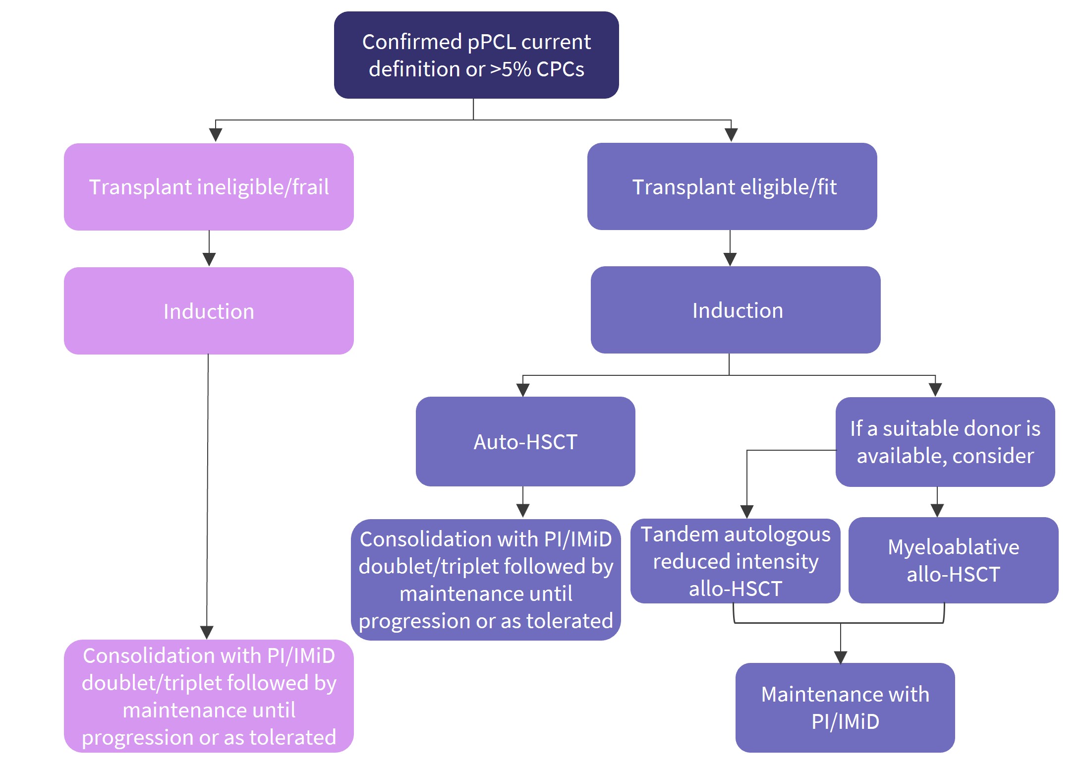 Based on the current evidence, Tuazon et al.1 recommend that treatment for patients with primary PCL should include a combination therapy incorporating a proteasome inhibitor, immunomodulatory drugs (IMiDs), steroids, and/or anthracyclines and alkylators as part of more intensive chemotherapy, followed by consolidative autologous hematopoietic stem cell transplantation (auto-HSCT) in eligible patients, and then maintenance therapy (Figure 3).