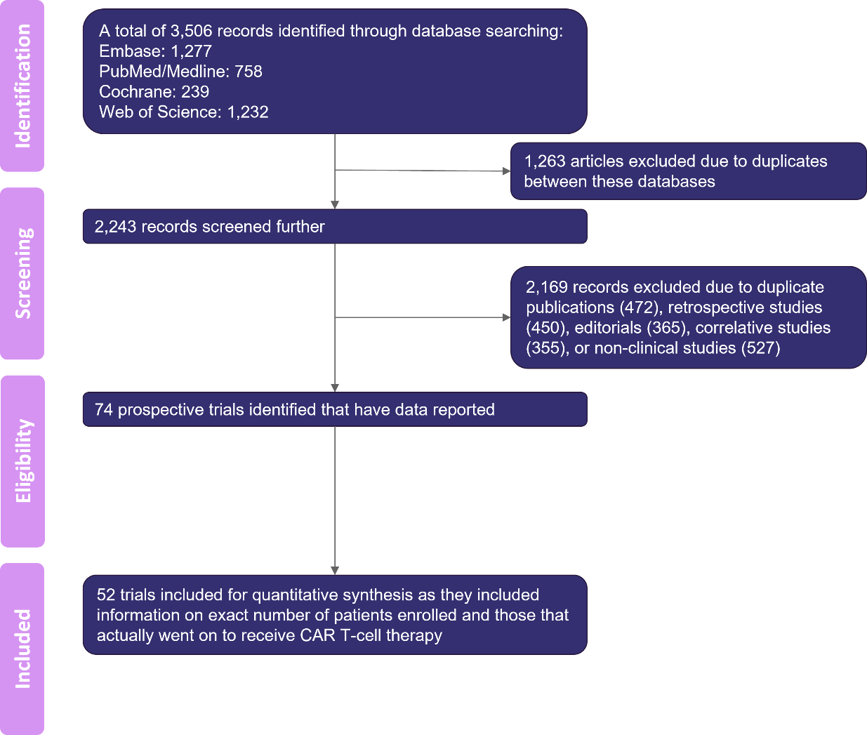 There were 74 CC19 CAR T-cell therapy studies identified, 52 (70.2%) of which reported the total number of patients who were enrolled and the number of patients who received CAR T-cell therapy (Figure 2).
