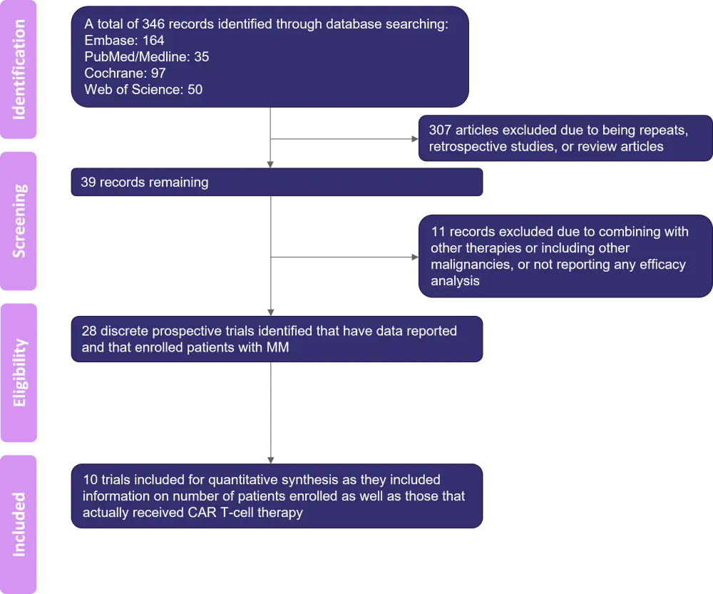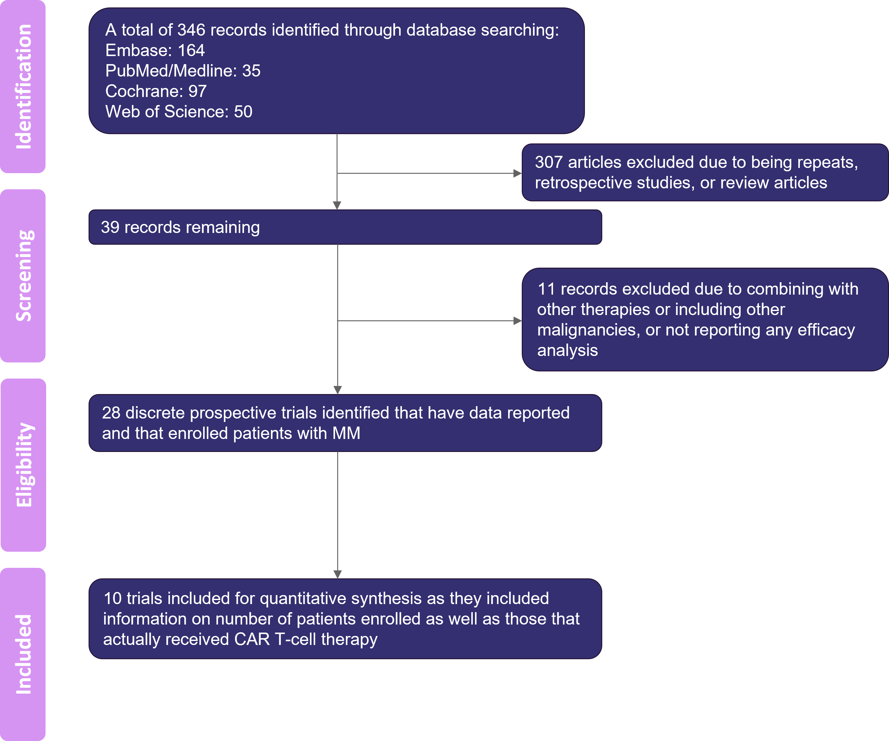 Of the 346 records identified through database searches, 28 BCMA CAR T-cell therapy clinical trials for patients with MM met the inclusion criteria; ten of these trials reported the number of patients enrolled and the number of patients who received CAR T-cell therapy (Figure 1).