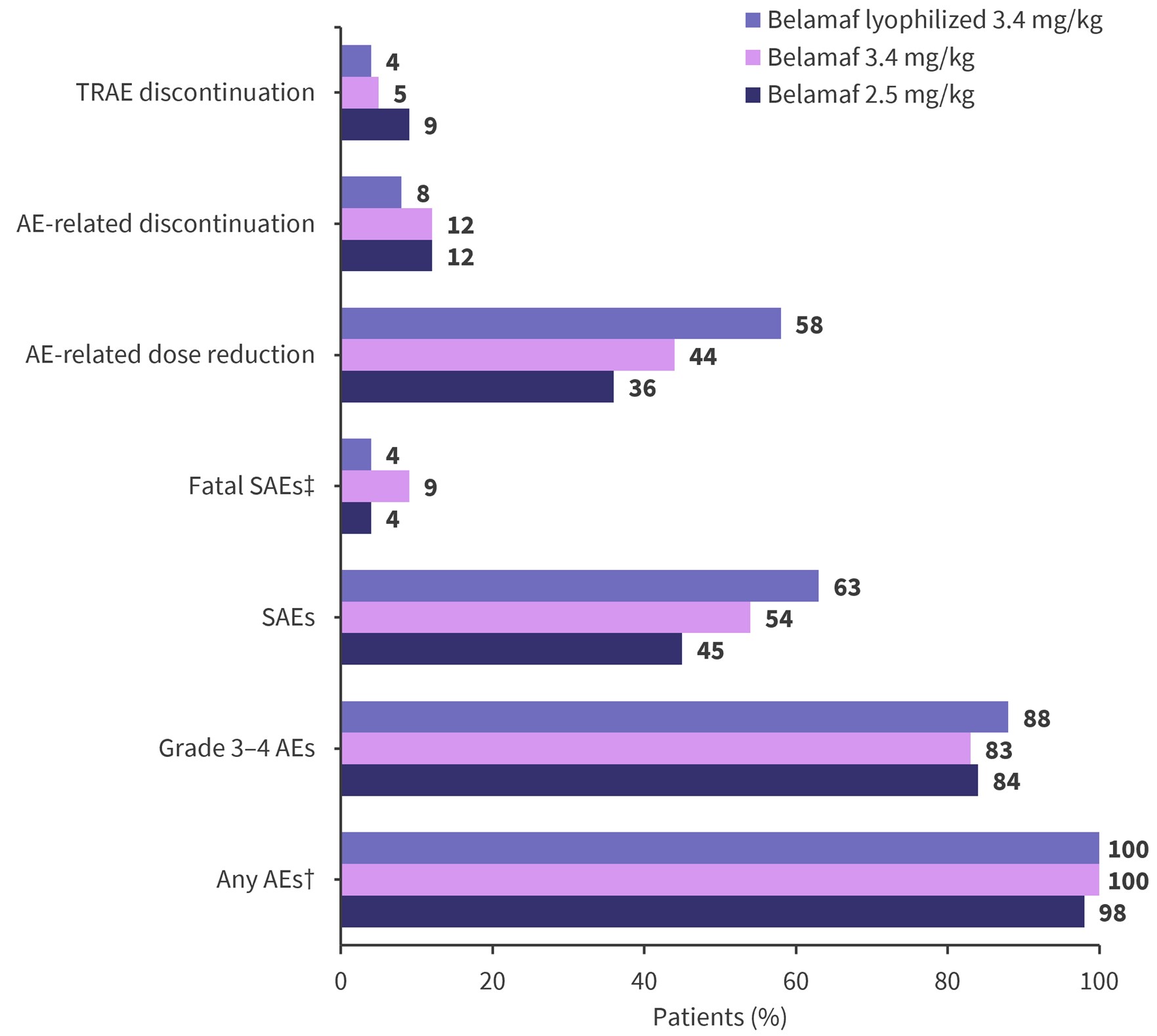 ‡In the 2.5 mg/kg, 3.4 mg/kg, and lyophilized cohorts, 1% (sepsis), 2% (1 cerebral hemorrhage, 1 hemophagocytic lymphohistiocytosis), and 0% of AEs were considered treatment related, respectively.