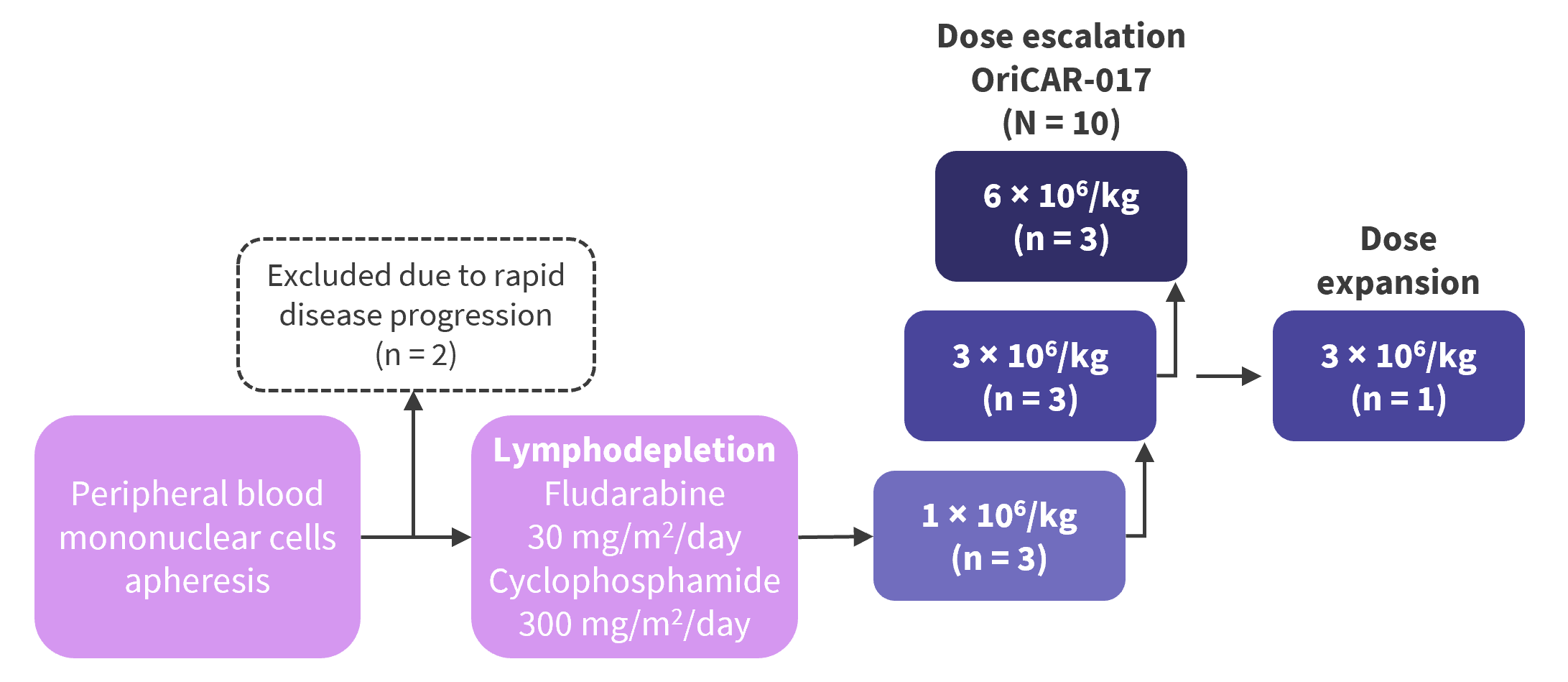 OriCAR-017 showed robust expansion in peripheral blood as well as bone marrow at all three dose levels. The median peak expansion for all three dose levels in peripheral blood was 10 days (range, 7–14 days) (Table 2).2