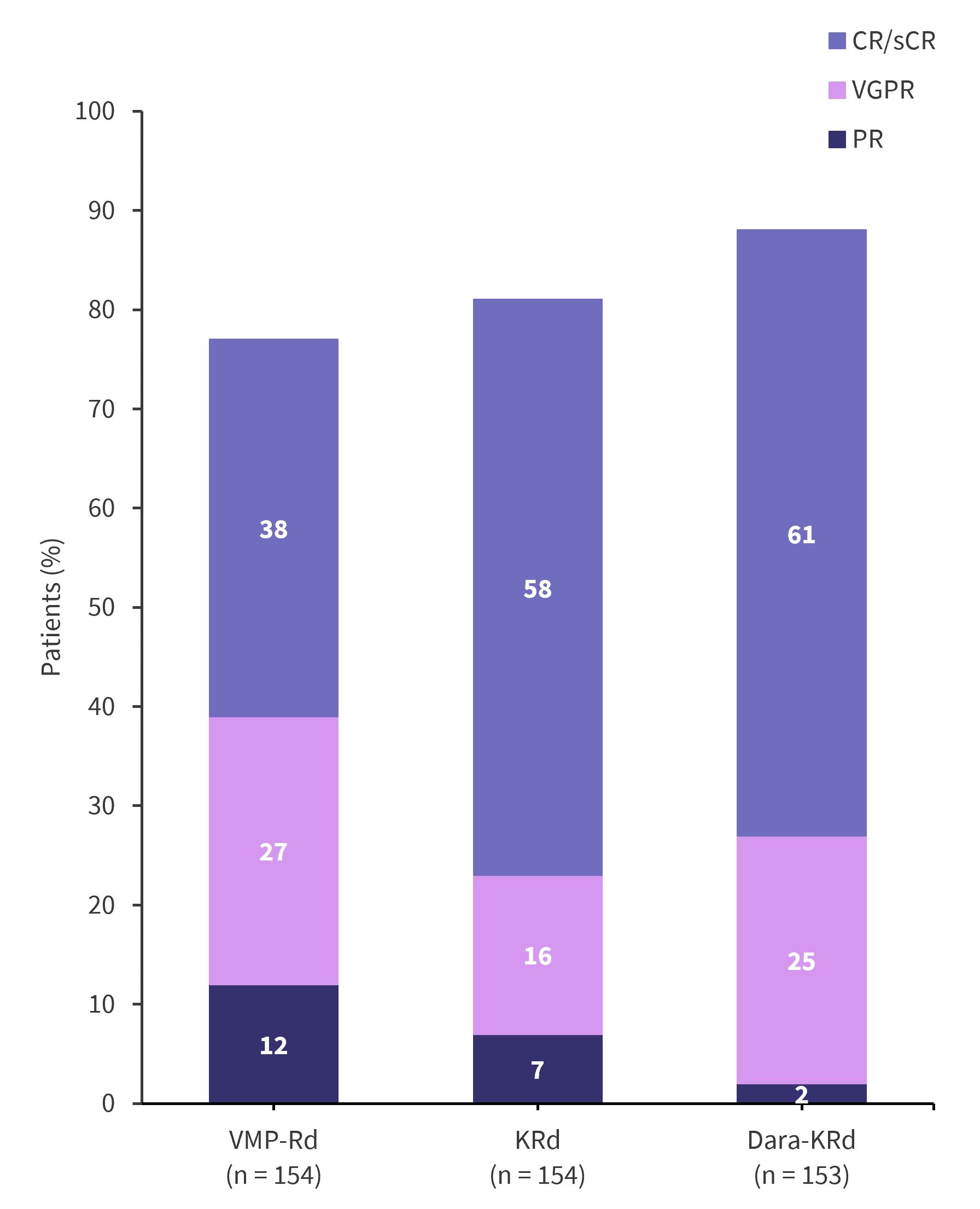 CR, complete response; D-KRd, carfilzomib-lenalidomide-dexamethasone-daratumumab; KRd, carfilzomib-lenalidomide-dexamethasone; ORR, overall response rate; PR, partial response; sCR, stringent CR; VGPR, very good PR; VMP-Rd, bortezomib-melphalan-prednisone.