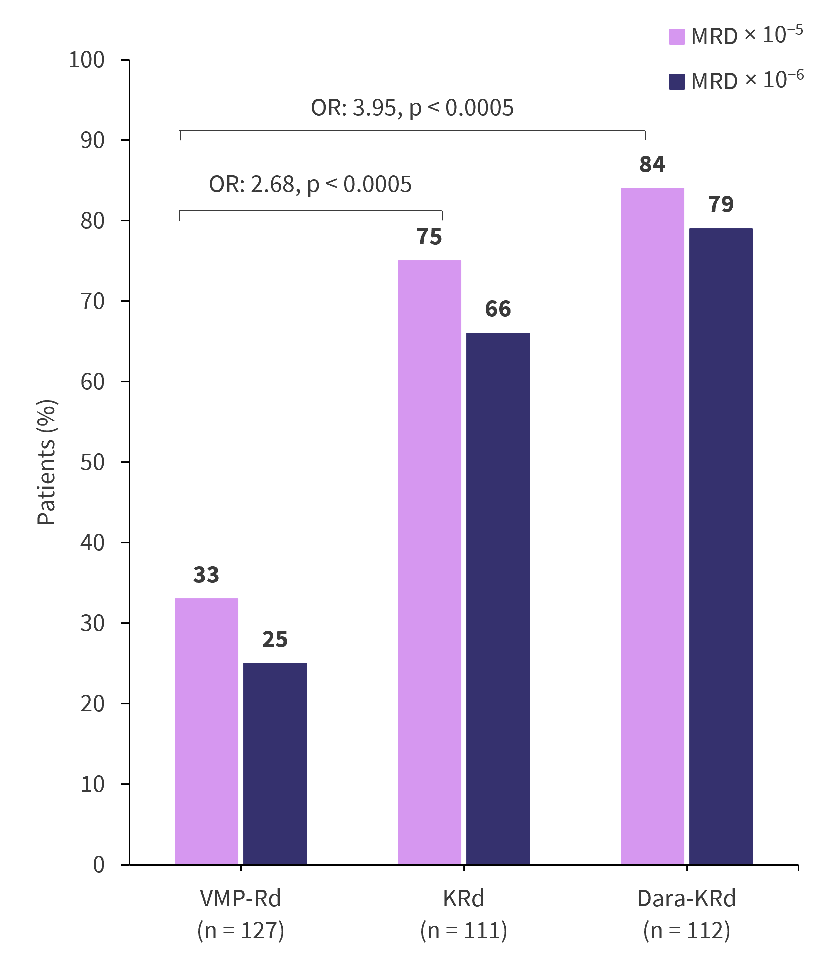 D-KRd, carfilzomib-lenalidomide-dexamethasone-daratumumab; KRd, carfilzomib-lenalidomide-dexamethasone; MRD, measurable residual disease; OR, odds ratio; VMP-Rd, bortezomib-melphalan-prednisone.