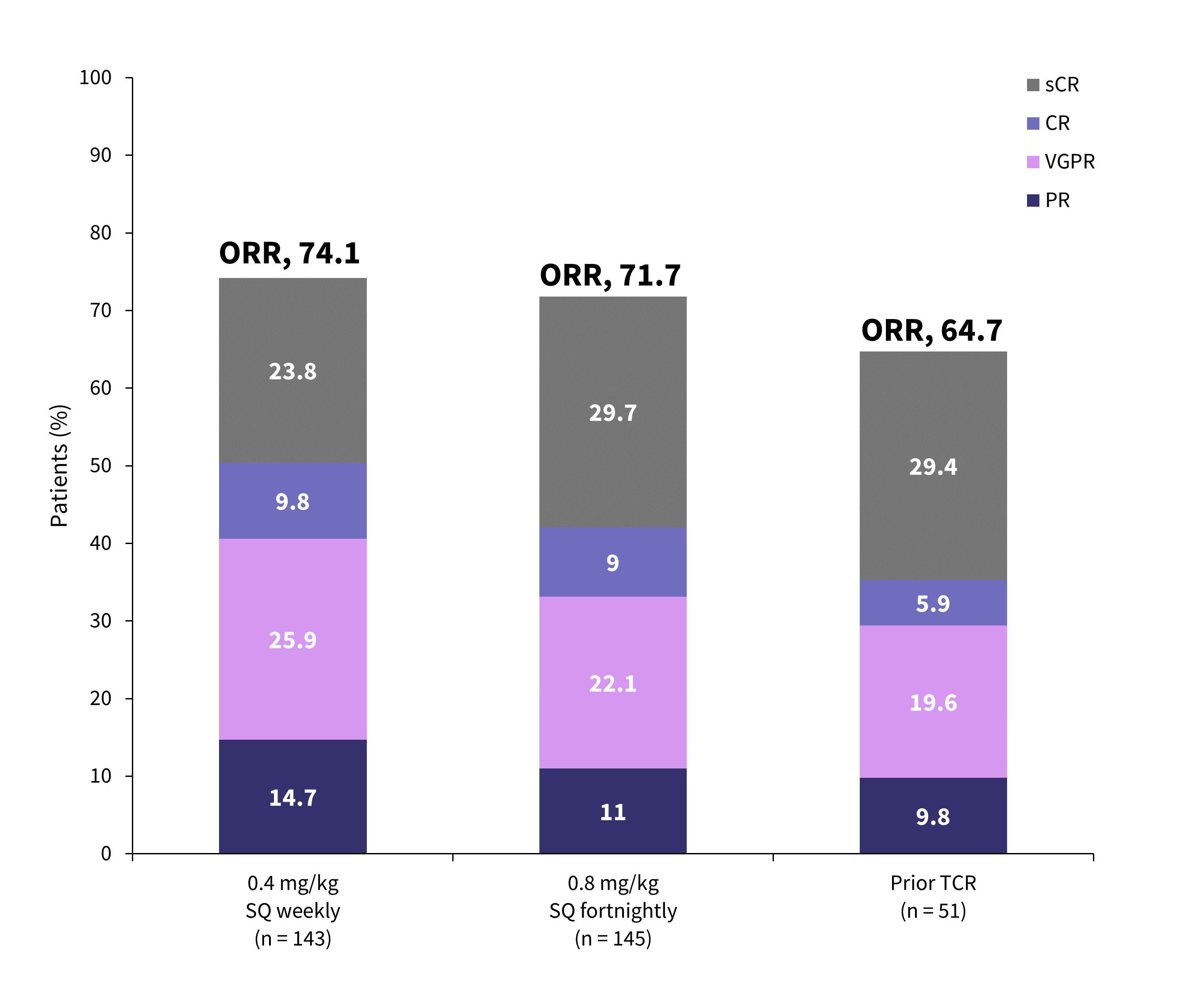 CR, complete response; ORR, overall response rate; PR, partial response; sCR, stringent complete response; SQ, subcutaneous; TCR, T-cell redirection; VGPR, very good partial response.