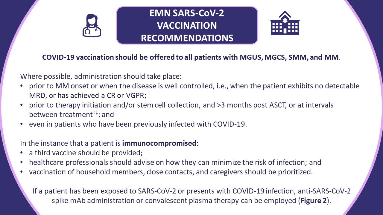Real-world data suggest that patients with MM are generally willing to receive a COVID-19 vaccine, more so than the general population. The EMN has set out vaccination guidelines for healthcare professionals involved in the treatment and care of patients with MGUS, smoldering multiple myeloma, multiple myeloma, and monoclonal gammopathies of clinical significance (Figure 3). It has been recommended that all patients with these conditions be vaccinated against COVID-19.