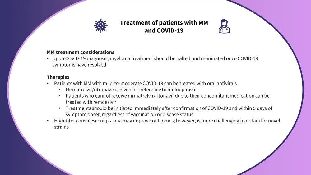 Following symptom onset and a positive test result for COVID-19, swift treatment is optimal to reduce the likelihood of poor outcomes. The recommended therapies for the treatment of COVID‑19, as well as considerations for managing existing myeloma treatment, are outlined in Figure 3.