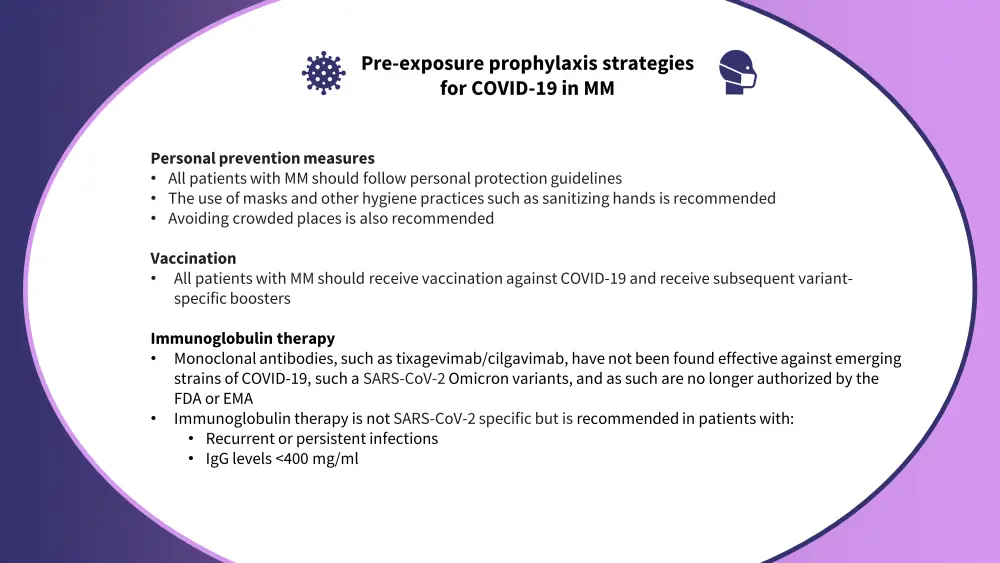The use of pre-exposure prophylaxis interventions is beneficial to patients with MM as a preventative method to reduce the risk of severe COVID-19 requiring hospitalization. Figure 2 outlines the recommended prophylaxis strategies for COVID-19 in patients with MM.