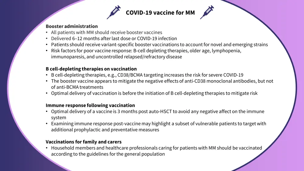 Patients with MM are often immunodeficient, which can limit the durability of response to vaccination. The typically advanced age of patients with MM, as well as other disease-related comorbidities, further reduce the overall effectiveness of the COVID-19 vaccine. To address this, the EMN highlight booster vaccinations as key in managing these patients.