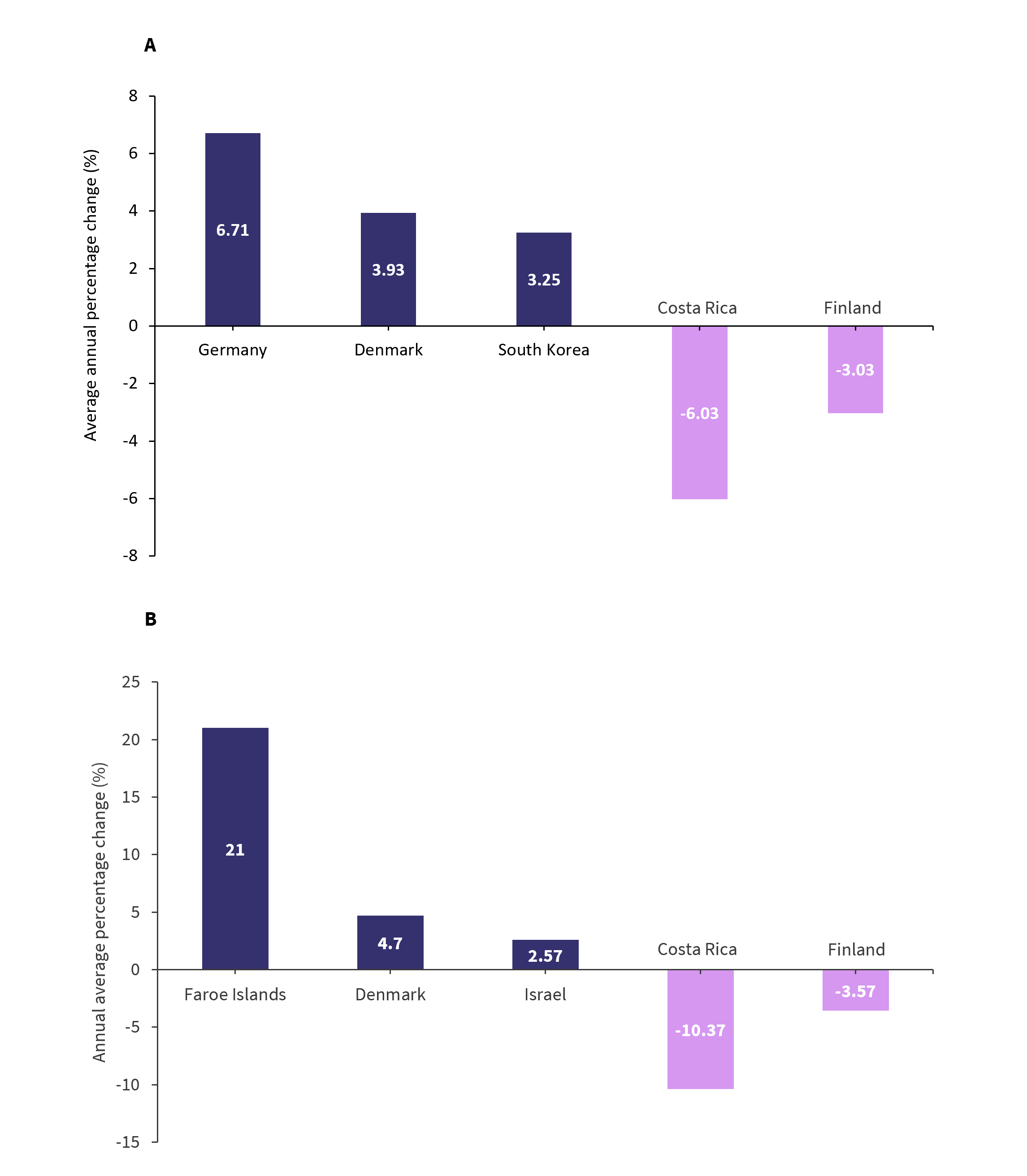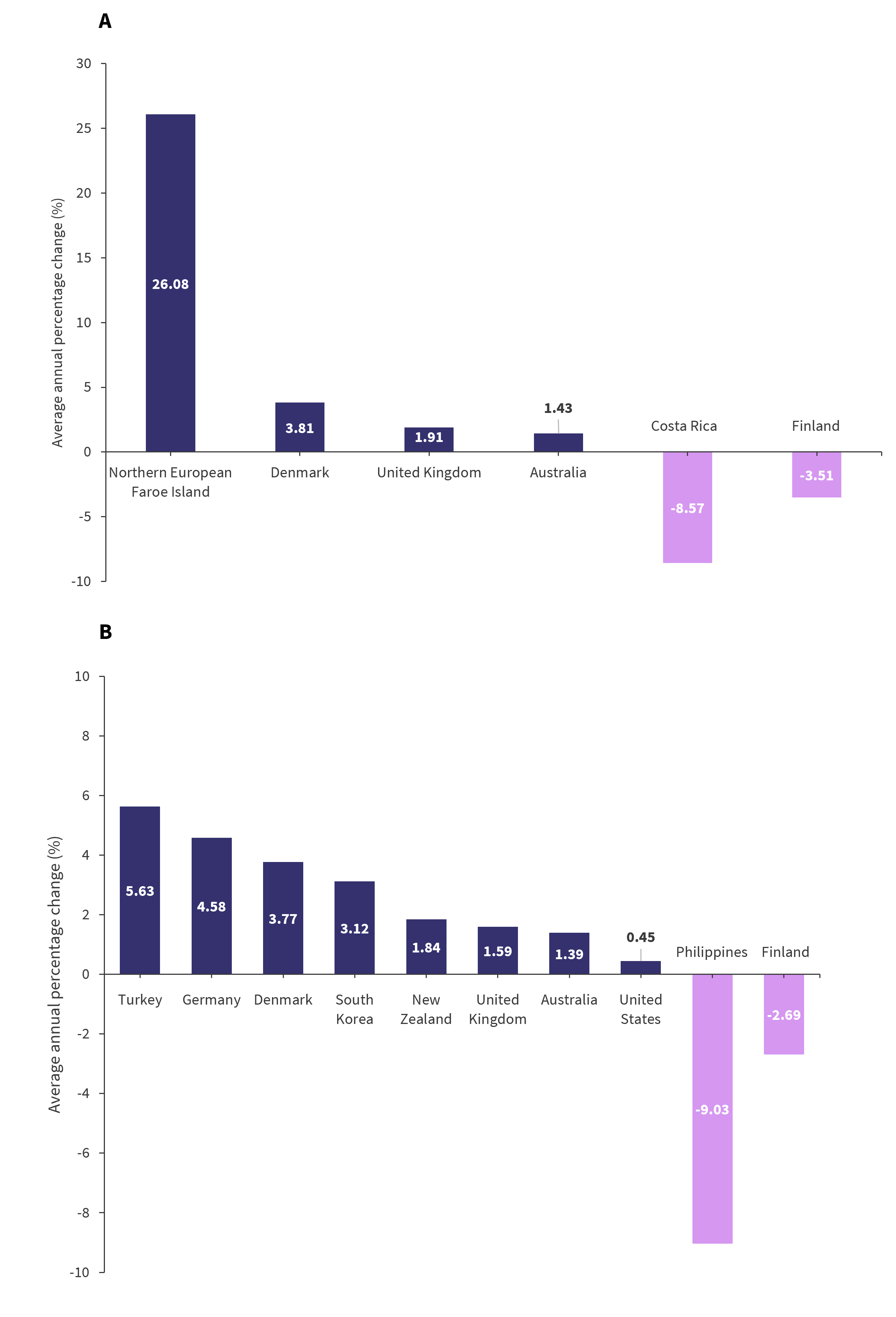 Figure 2A and B. Countries reporting a significant change in incidence of MM in women A and men B from 2001–2019*