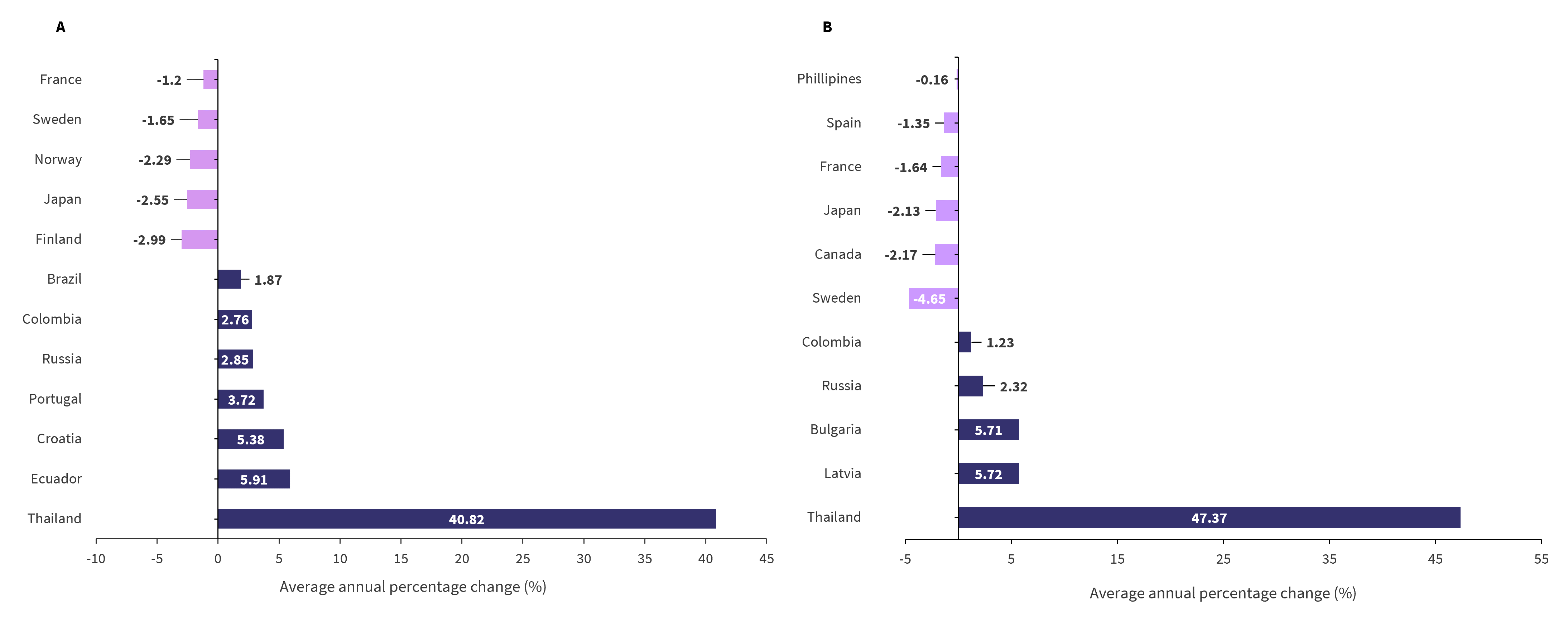 Mortality associated with MM in men was significantly increased in seven countries (Figure 3A), with Thailand showing the highest significant average annual percentage change (AAPC) at 40.82%; this was over six times higher than the second highest, Ecuador. Thailand also was the country that showed the greatest increase in women (AAPC, 47.37%), followed by Latvia (Figure 3B). The authors noted that these must be analyzed with respect to the baseline mortality rates to enable a comprehensive assessment of trends.