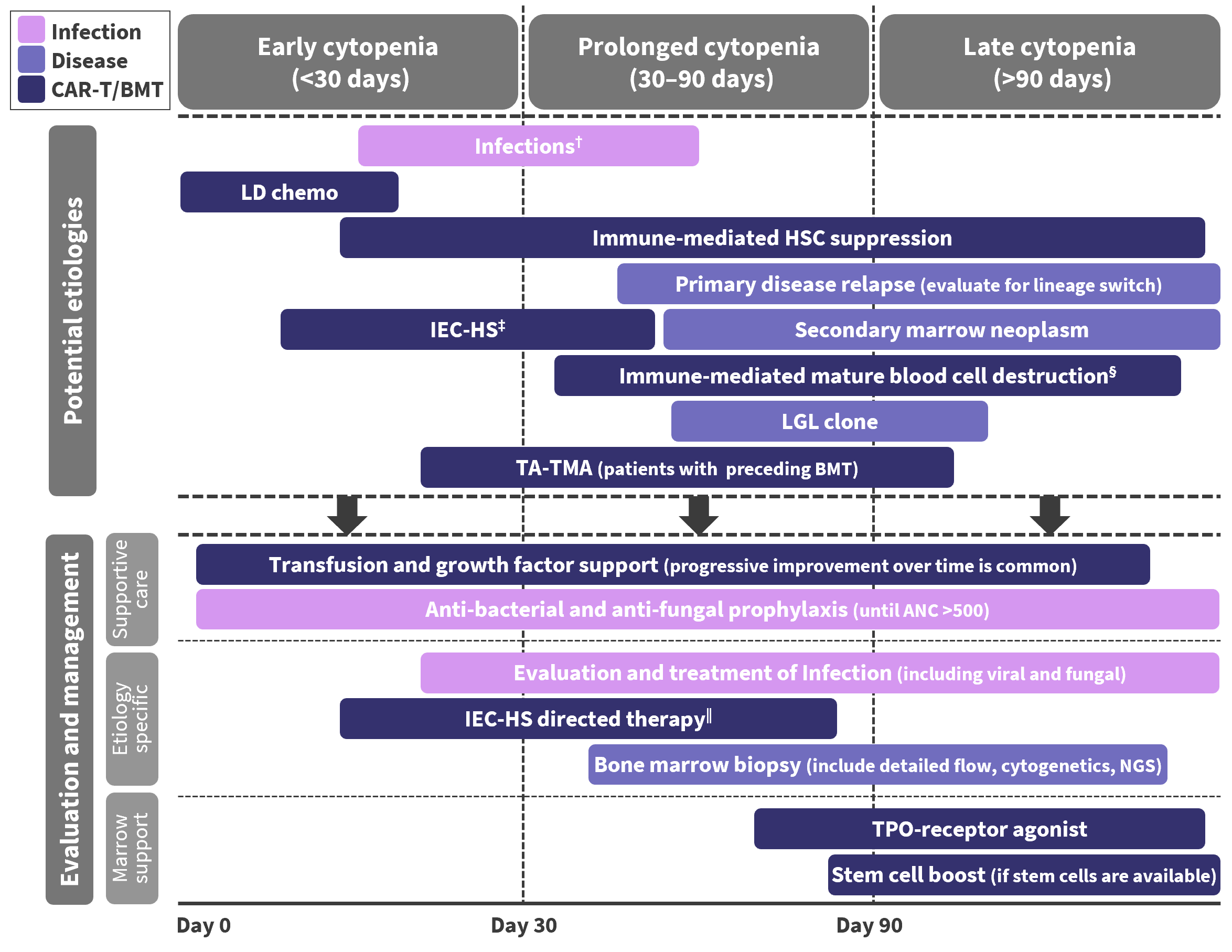 Cytopenia may be caused by several underlying pathophysiological mechanisms and can be classified into three types by considering the timeline from CAR T-cell infusion. Figure 1 shows the potential underlying etiologies and recommended management strategies proposed by Jain et al.2