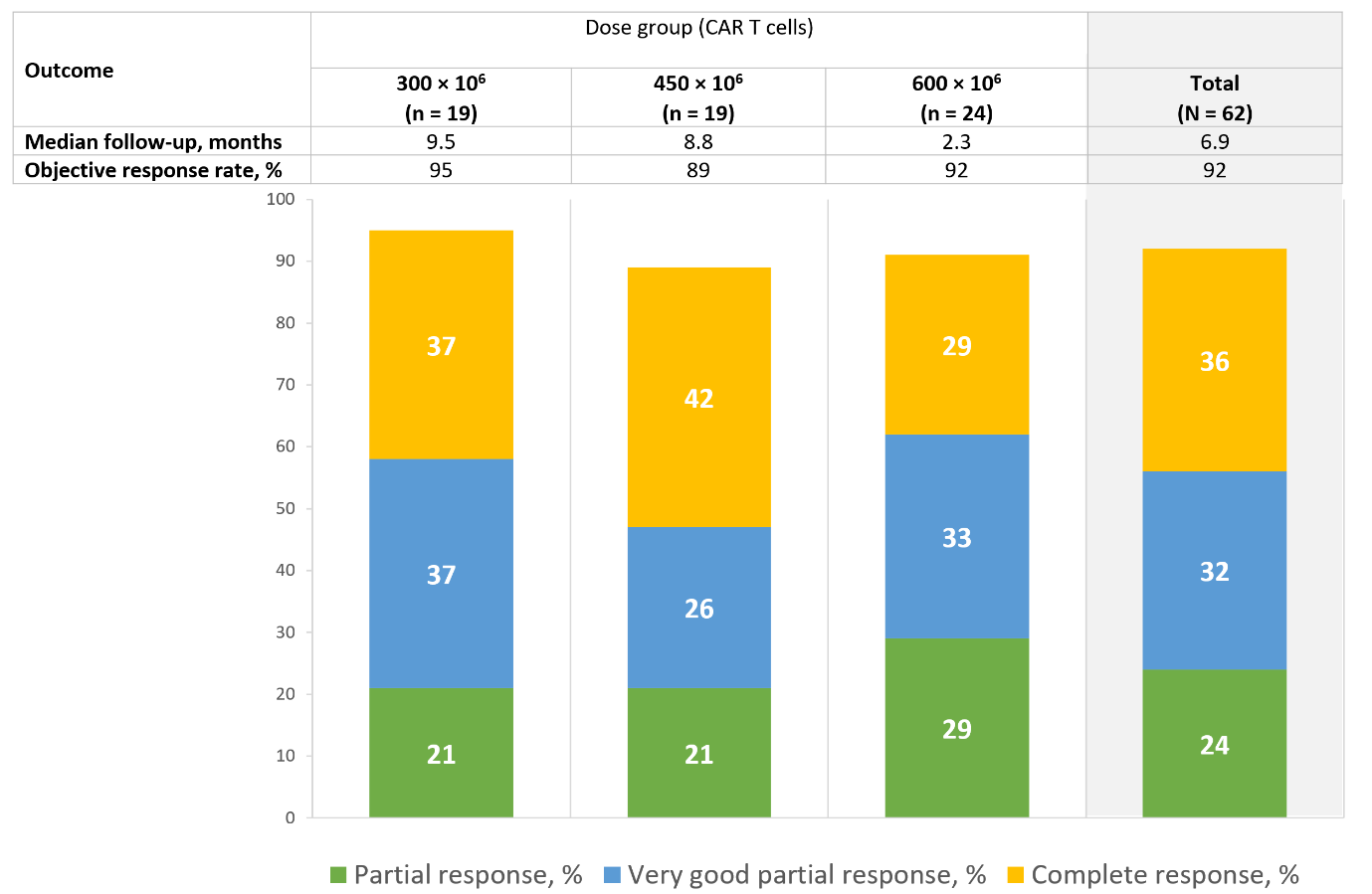 The objective response rate was 92% for all dose groups, and 68% of patients reached at least a very good partial response (see Figure 1). Of all evaluable patients, 84% were measurable (minimal) residual disease (MRD) negative at 1 × 10-5 depth at Month 3. Six months after infusion, persistent CAR T cells were detected in 69% of evaluable patients.