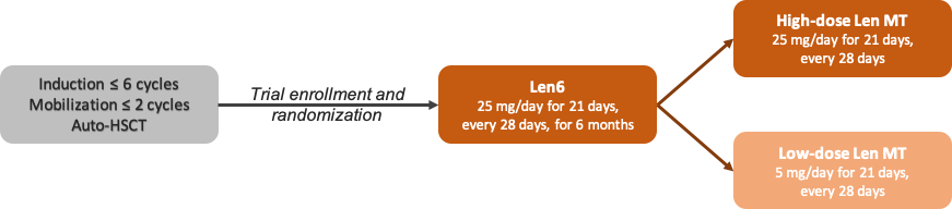 Patients were 18–75 years old, diagnosed with MM, and treated with ≤ 6 cycles of induction (not with Len), up to 2 cycles for mobilization, and auto-HSCT (between 90–120 days) before trial entry. Patient randomization was stratified by International Staging System (ISS) stage, age at diagnosis, and response after high-dose chemotherapy. All enrolled patients received Len at a dose of 25 mg/day for 21 days, every 28 days for 6 months (Len6), and then continued with their assigned dose: the high-dose arm moved onto Len MT at a dose of 25 mg/day, and the low-dose arm began Len MT at 5 mg/day. Maintenance therapy was prescribed until disease progression or limiting toxicity (Figure 1).