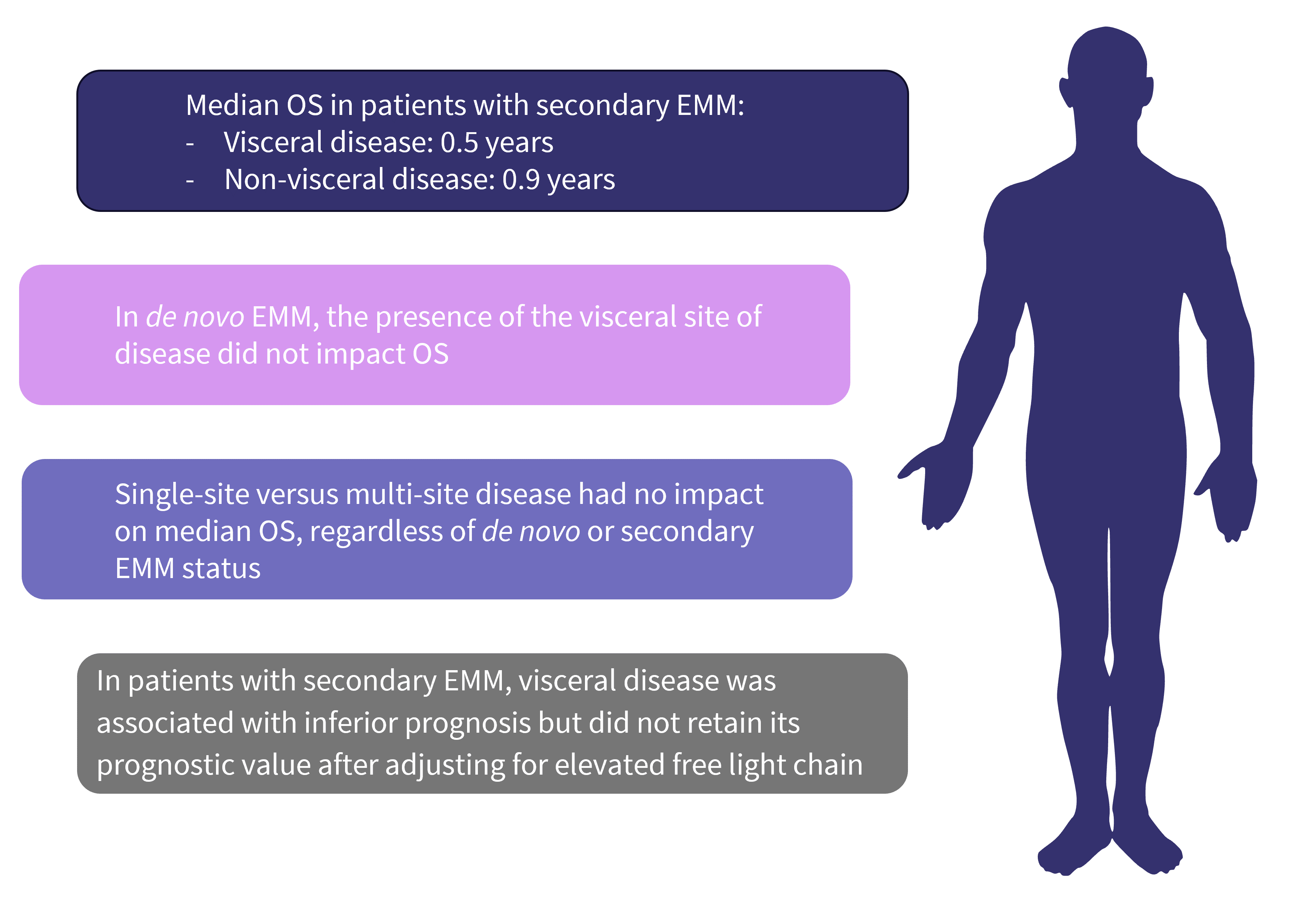 The presence of visceral versus non-visceral disease in patients with secondary EMM impacted median overall survival (OS) rates, resulting in a difference of 0.4 years. The impact of the site of extramedullary disease on OS and prognosis in patients with secondary and de novo EMM are shown in Figure 2.