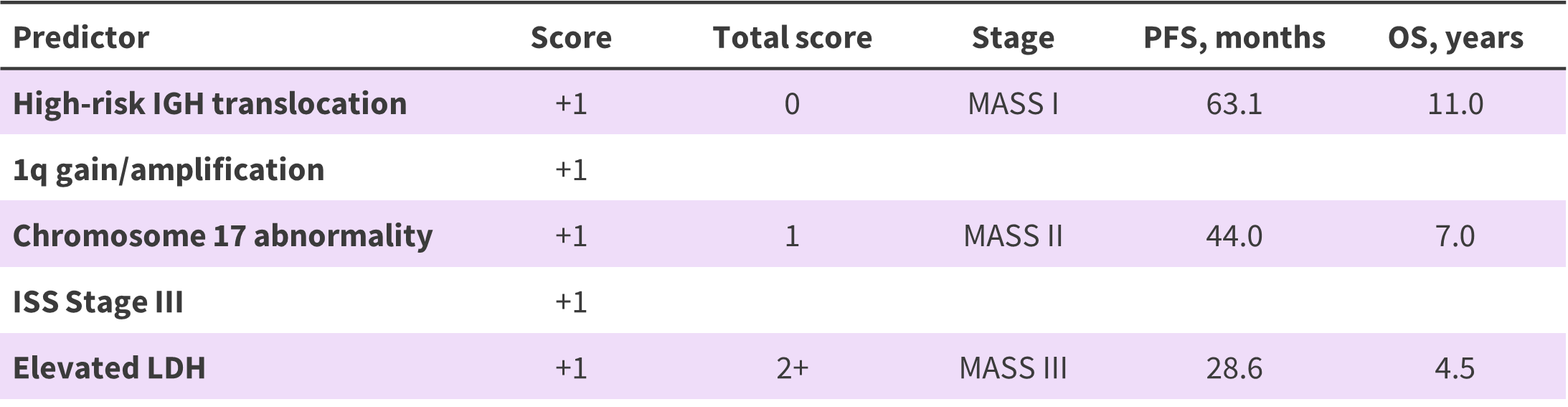 IGH, immunoglobulin heavy chain locus; ISS, International Staging System; LDH, lactate dehydrogenase; MASS, Mayo Additive Staging System; OS, overall survival; PFS, progression-free survival.