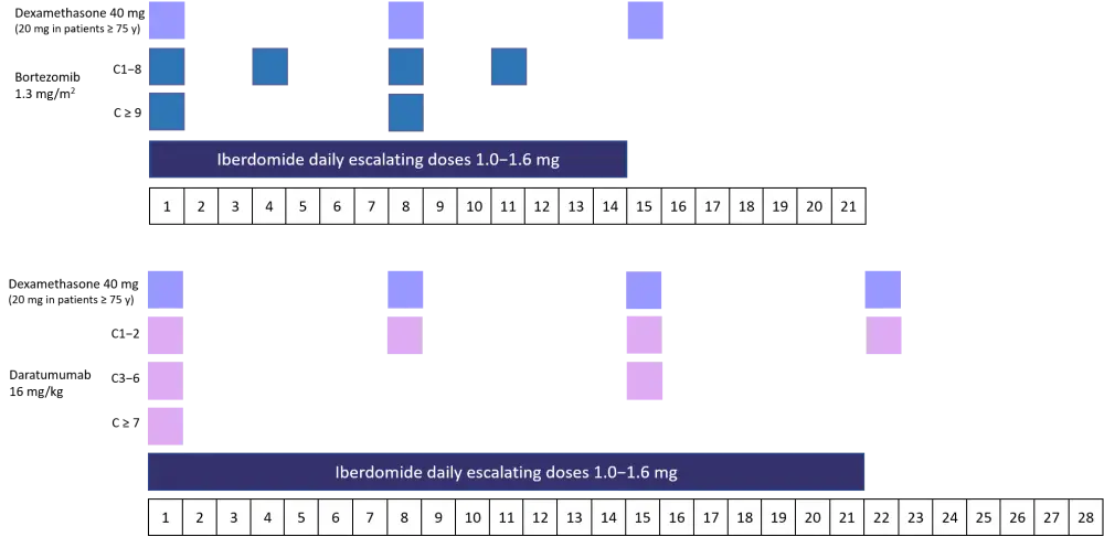ASCT, autologous stem cell transplantation; Dara, daratumumab; Dex, dexamethasone; ECOG PS, Eastern Cooperative Oncology Group performance score; Iber, iberdomide; IMiD, immunomodulatory drugs; IPSS, International Prognostic Scoring System; PI, proteasome inhibitor |