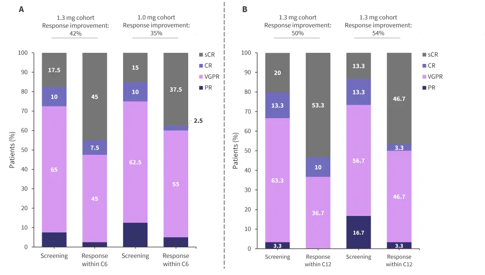 Both Cohorts 1 and 2 experienced significant improvements in response after six and 12 cycles. After six treatment cycles, patients treated with 1.3 mg iberdomide experienced a larger response improvement. However, after 12 cycles, the 1.0 mg cohort had the largest overall improvement from baseline (Figure 2).