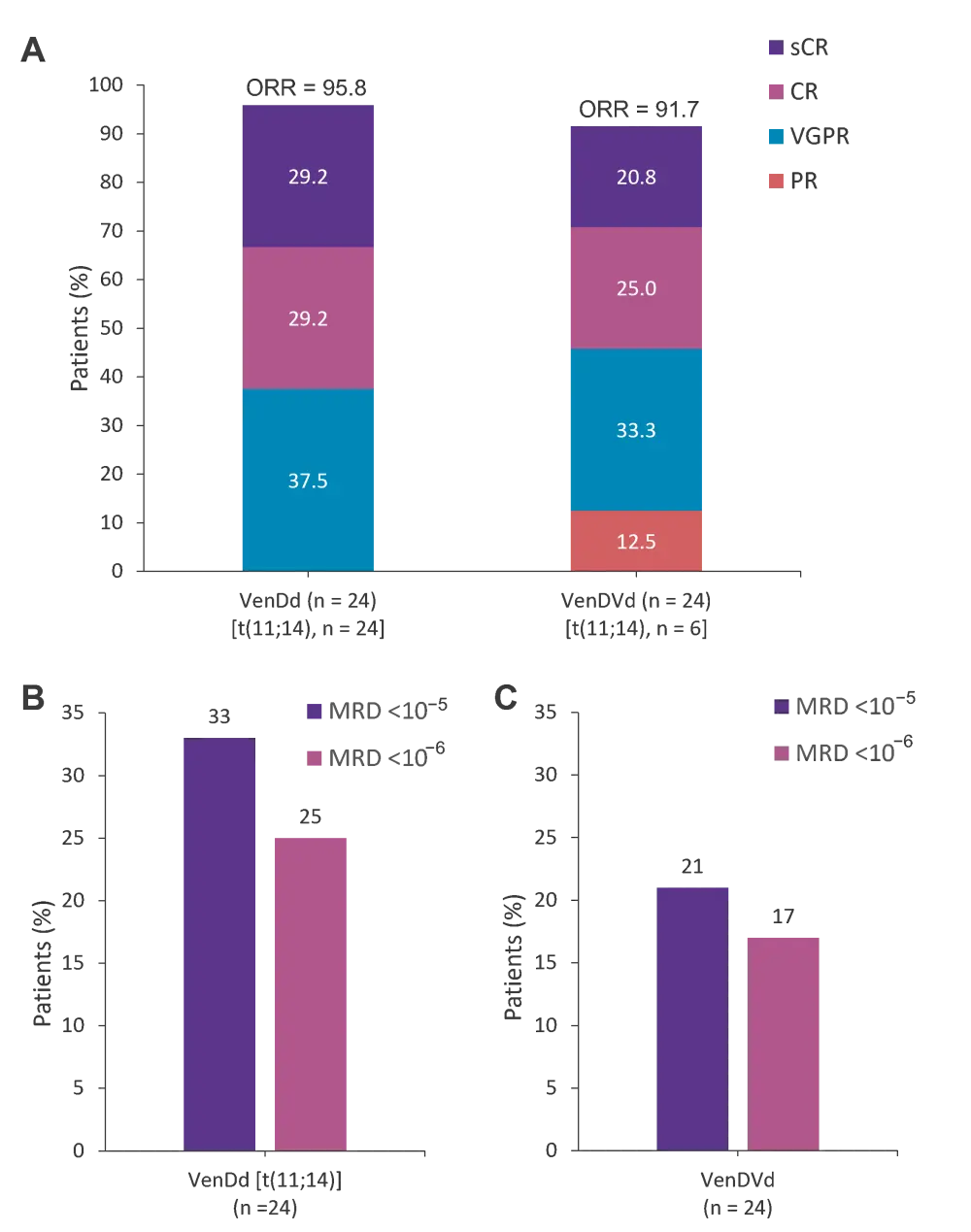 CI, confidence interval; CR, complete response; MRD, minimal residual disease; ORR, overall response rate; PR, partial response; sCR, stringent complete response; VenDd, venetoclax, daratumumab, and dexamethasone; VenDVd, venetoclax, daratumumab, bortezomib, and dexamethasone; VGPR, very good partial response.