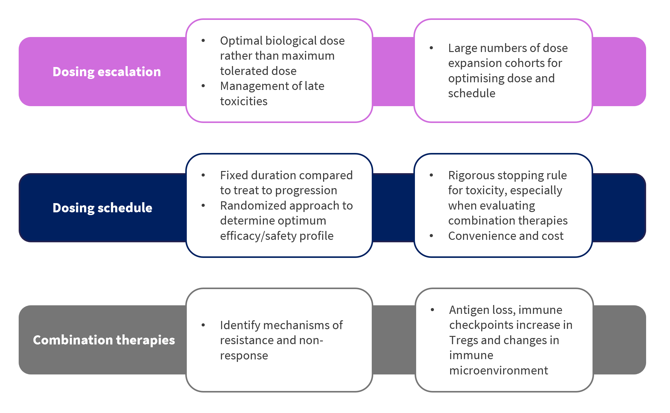 Determining the optimal dosing schedule remains a challenge for immune therapies. In particular, IgG- based therapies possess an expected half-life of 2–3 weeks, thus may require continuous dosing. Furthermore, bispecific antibodies have a time to first response of around 1 month and so present an opportunity for future trials to evaluate different maintenance schedules after initial induction.