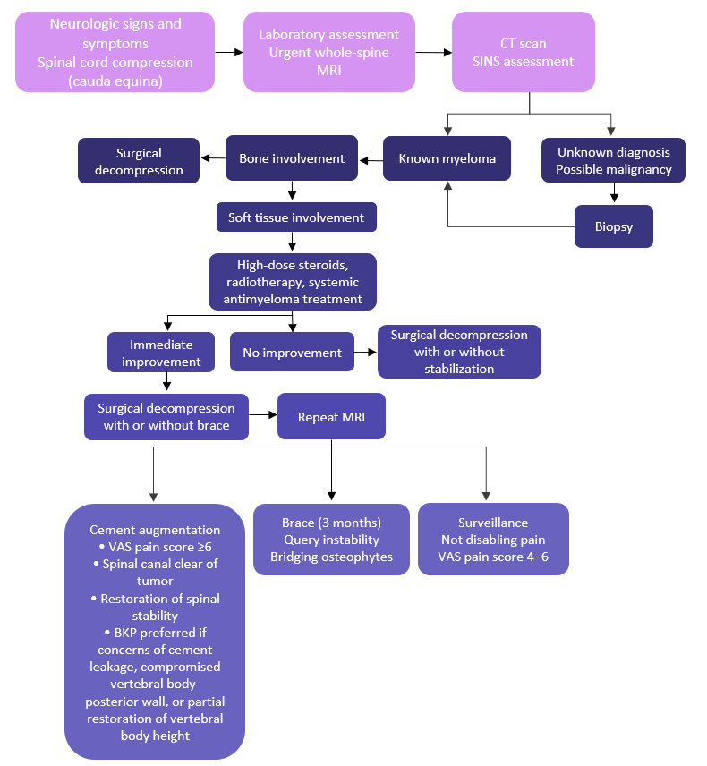 The BWG of the IMWG recommend balloon kyphoplasty and vertebroplasty (Grade C) for patients with painful vertebral compression fractures. Radiotherapy (Grade C) is suggested for uncontrolled pain, impeding or symptomatic spinal cord compression, or pathological fractures. The algorithmic approach used to guide the decision-making process of treating patients with neurologic signs and symptoms due to spinal cord compression is presented in Figure 1.