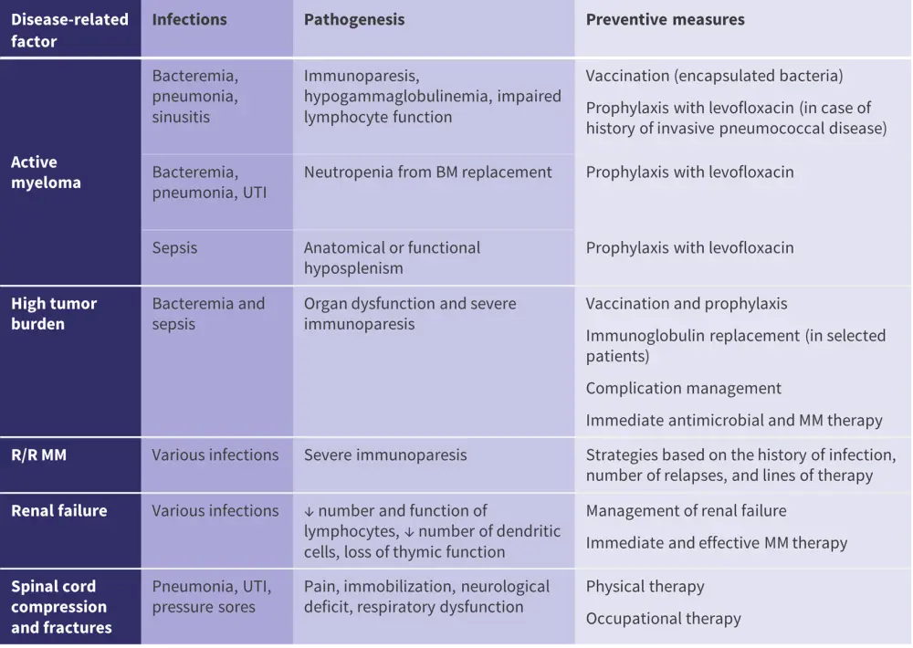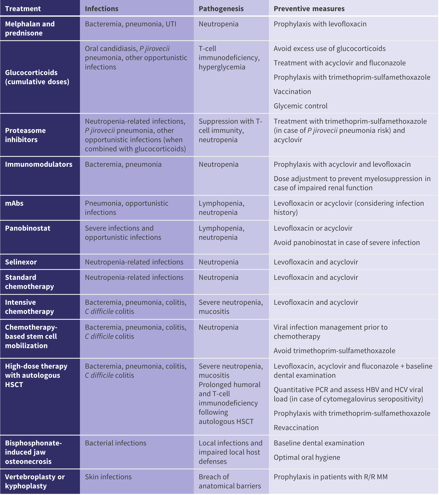 Infection is a major concern in patients with multiple myeloma (MM), leading to morbidity and mortality, and it may occur due to several reasons. Infection risk is highest within the first 3 months of diagnosis and during treatment for MM and it may peak again in cases of relapse and severely impaired immunity. Preventive measures play an important role in reducing the risk; however, there are no global guidelines in this regard.1