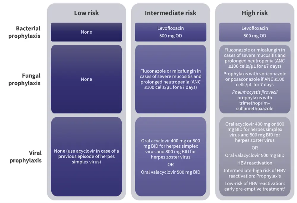 Infections may occur due to several factors related to disease, treatment, or the individual patient. Figure 2 and Figure 3 summarizes disease- and treatment-related factors (respectively), possible infectious events, pathogenesis, and preventive measures.