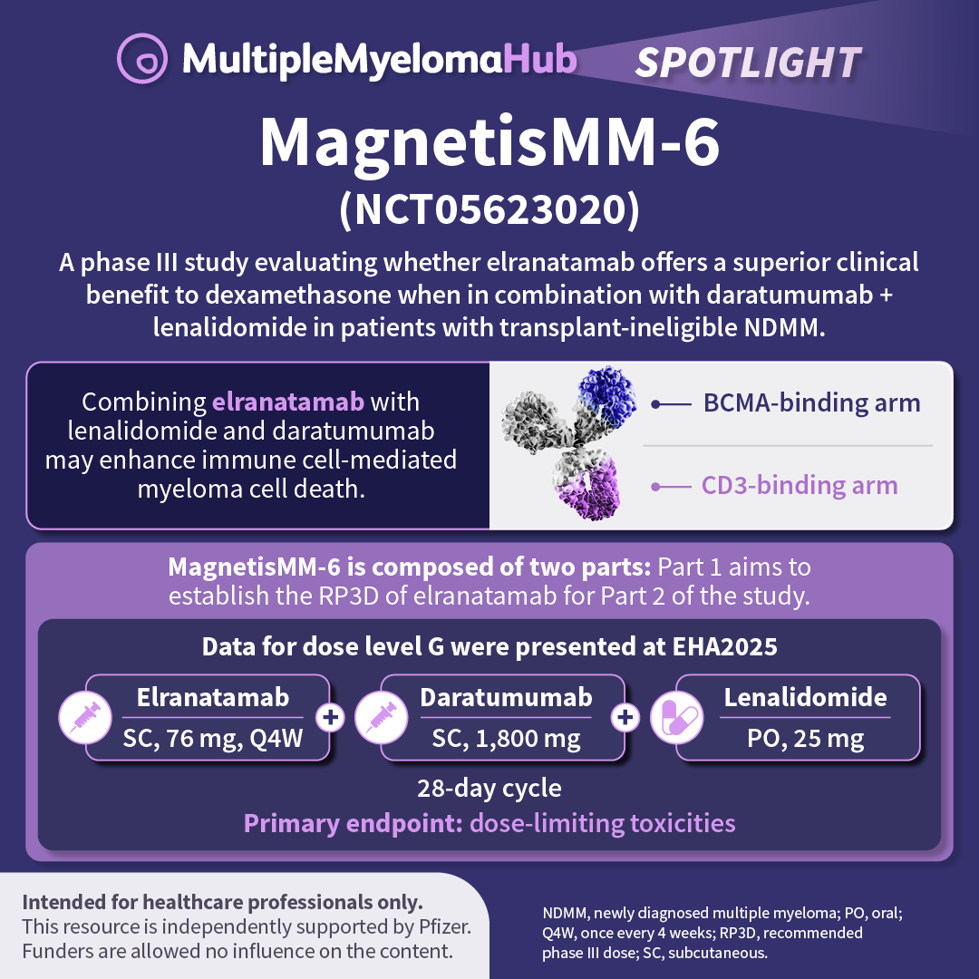 Dose level G consisted of EDR administered in 28-day cycles, with subcutaneous elranatamab 76 mg every 4 weeks. The dose level G informed the recommended phase III dose of elranatamab for part 2 of MagnetisMM-6, due to its benefit–risk balance.