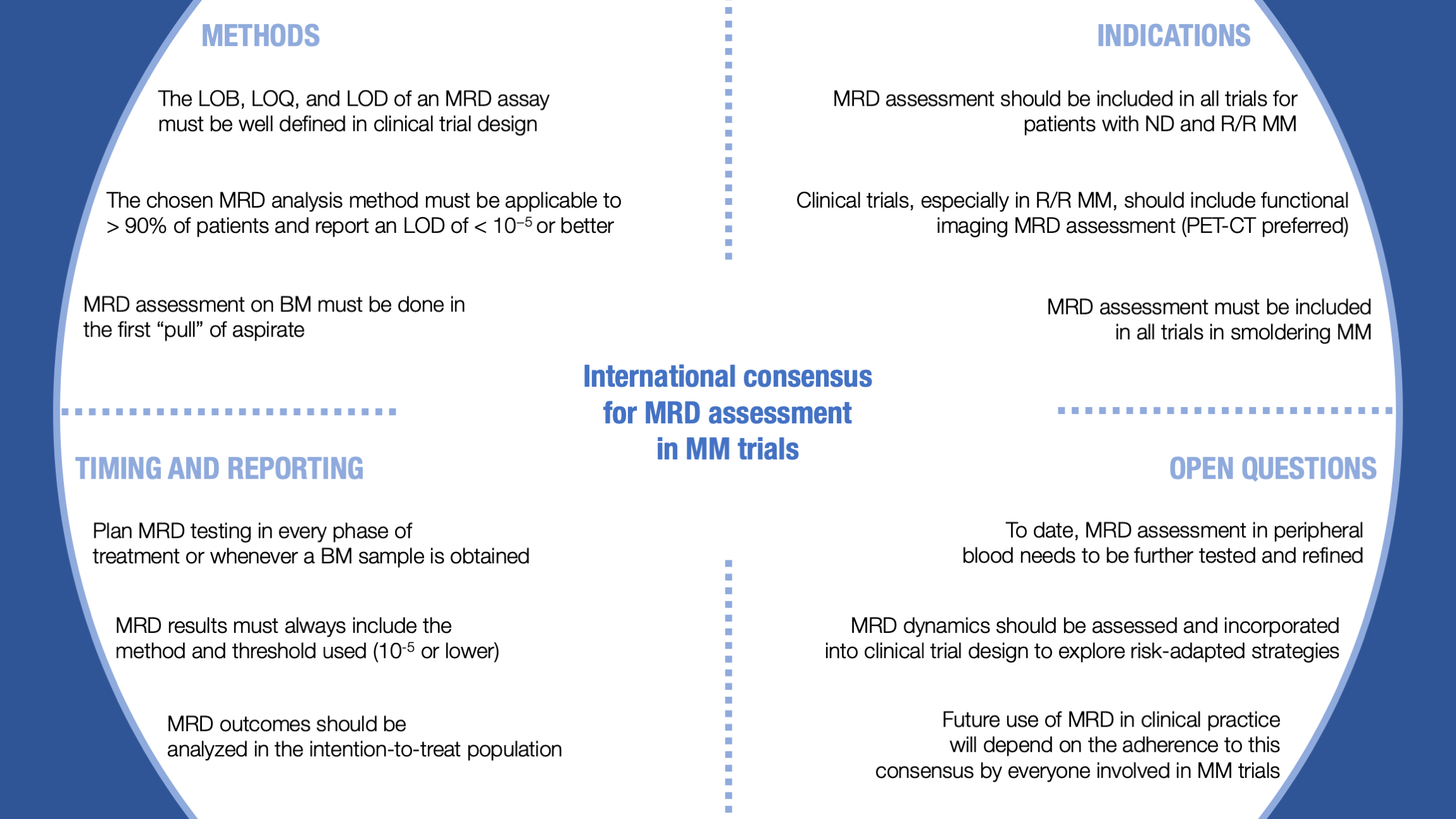 Measurable (minimal) residual disease (MRD) has become a widely used readout in multiple myeloma (MM) clinical trials. In addition, it has become an established clinical endpoint and a determinant of patient treatment approaches, yet methods to assess and report MRD lack uniformity. In a plea to overcome inconsistencies and further improve the patient outlook in the MM setting, a panel of MM investigators came together to harmonize MRD assessment across clinical trials.