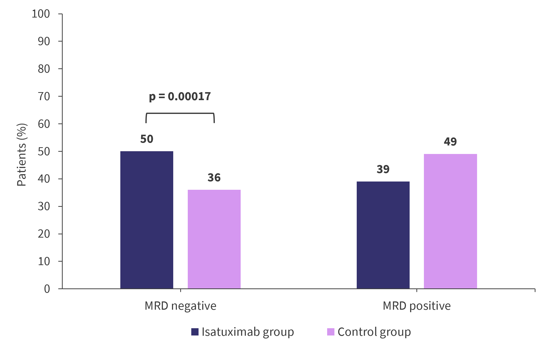 A total of 18% of patients in the treatment group achieved both a complete response and negative MRD compared with 14% of patients in the control group (p = 0.17). A very good partial response with negative MRD was achieved by 47% of patients in the treatment group and 32% in the control group (p < 0.0001).