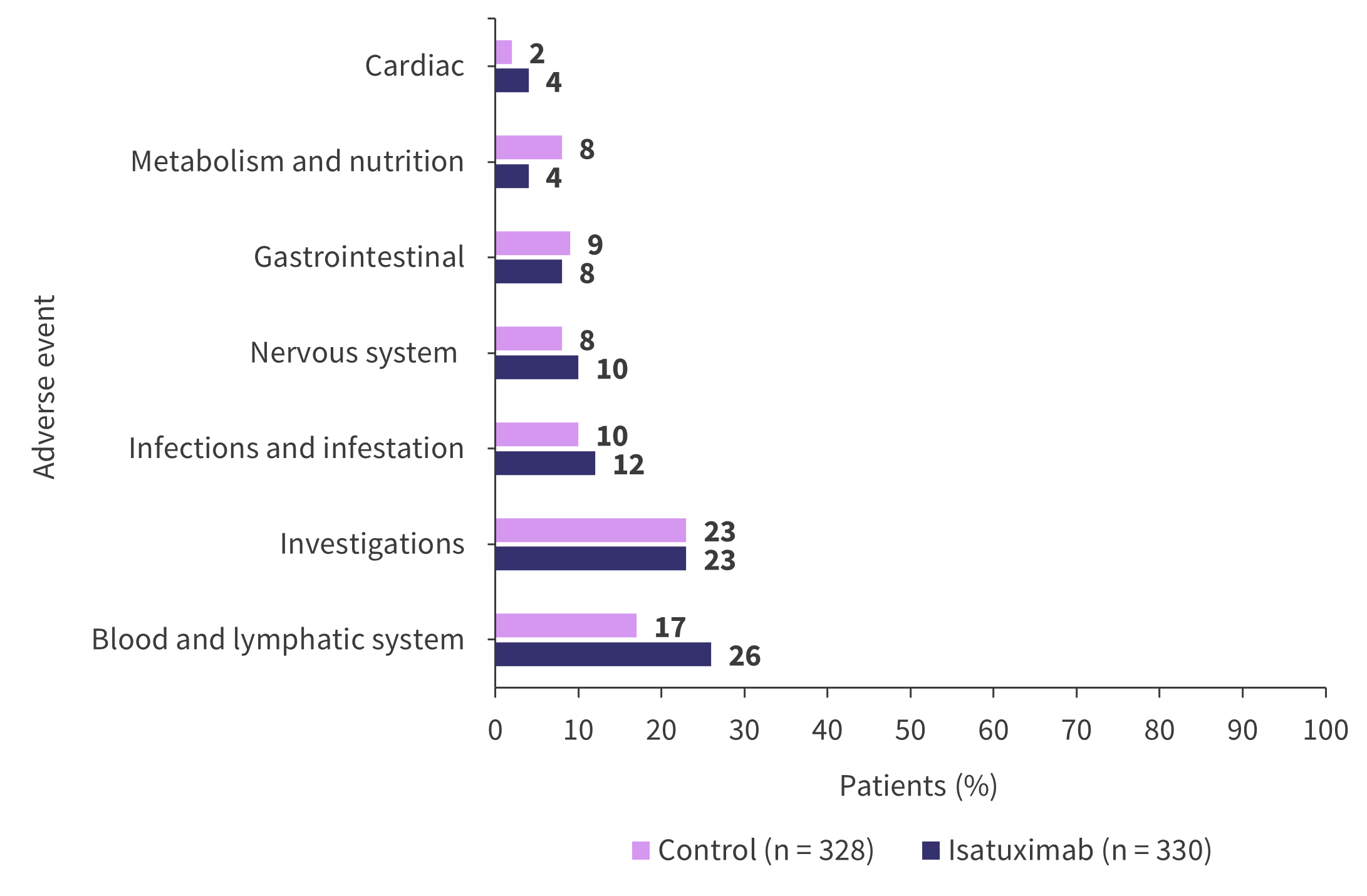 Neutropenia of Grade 3 or 4 was experienced by 23% of patients treated with isatuximab and 7% in the control group. A total of 10% of patients from the control group experienced Grade 3 or 4 infections compared with 12% of patients treated with isatuximab. Grade 3 or 4 isatuximab infusion-related events were recorded in only 1% of patients.
