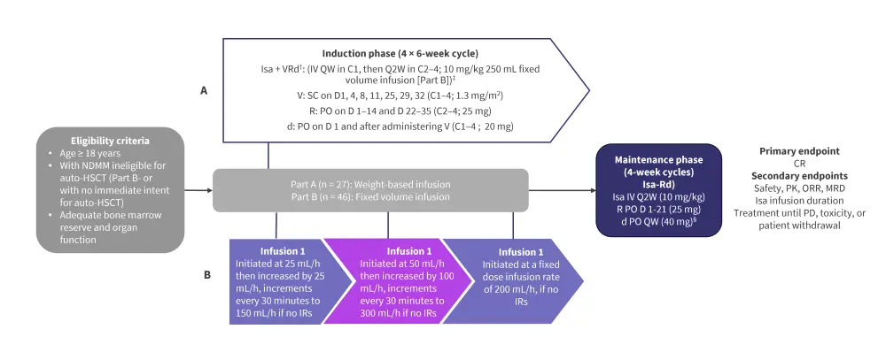 Auto-HSCT, autologous hematopoietic stem cell transplantation; C, cycle; CR, complete response; d, dexamethasone; D, day; IR, infusion reaction; Isa, isatuximab; IV, intravenously; MRD, minimal residual disease; NDMM, newly diagnosed multiple myeloma; ORR, overall response rate; PD, progressive disease; PK, pharmacokinetics; PO, orally; QW, once weekly; Q2W, every other week; R, lenalidomide; SC, subcutaneous; V, bortezomib.