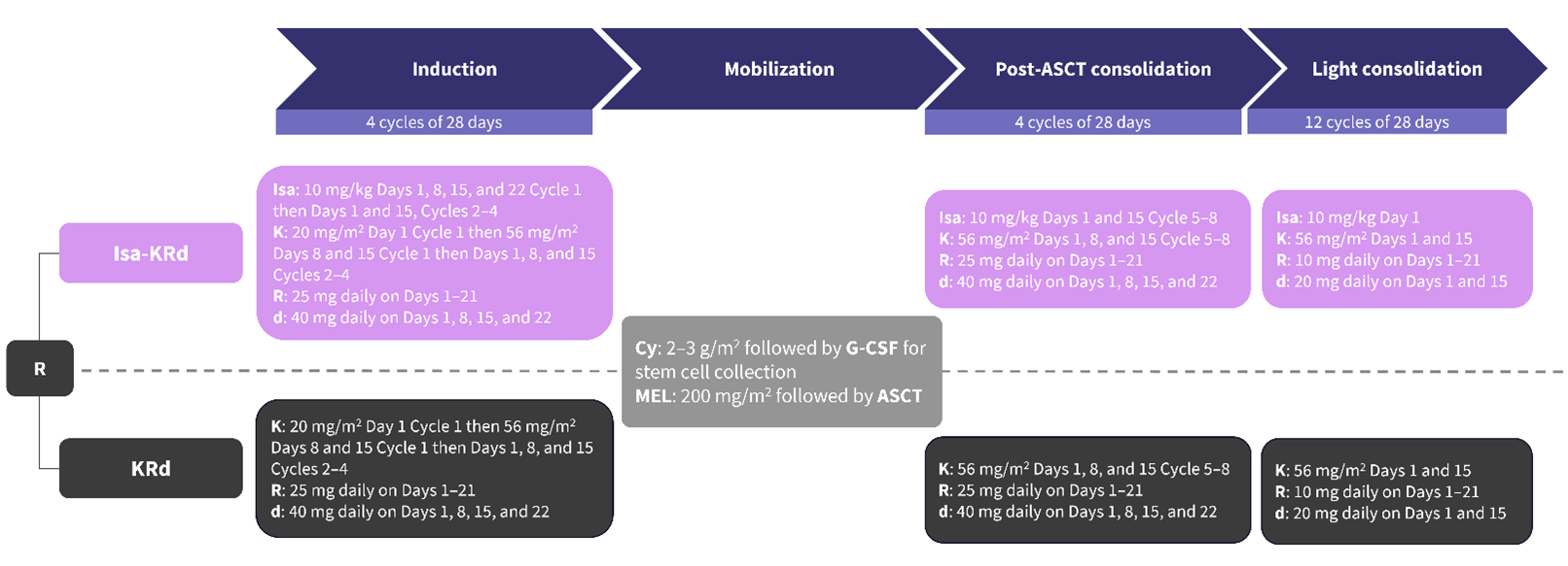 ASCT, autologous stem cell transplant; Cy, cyclophosphamide; d, dexamethasone; G-CSF, granulocyte-colony stimulating factor; Isa, isatuximab; K, carfilzomib; MEL, melphalan; R, lenalidomide.