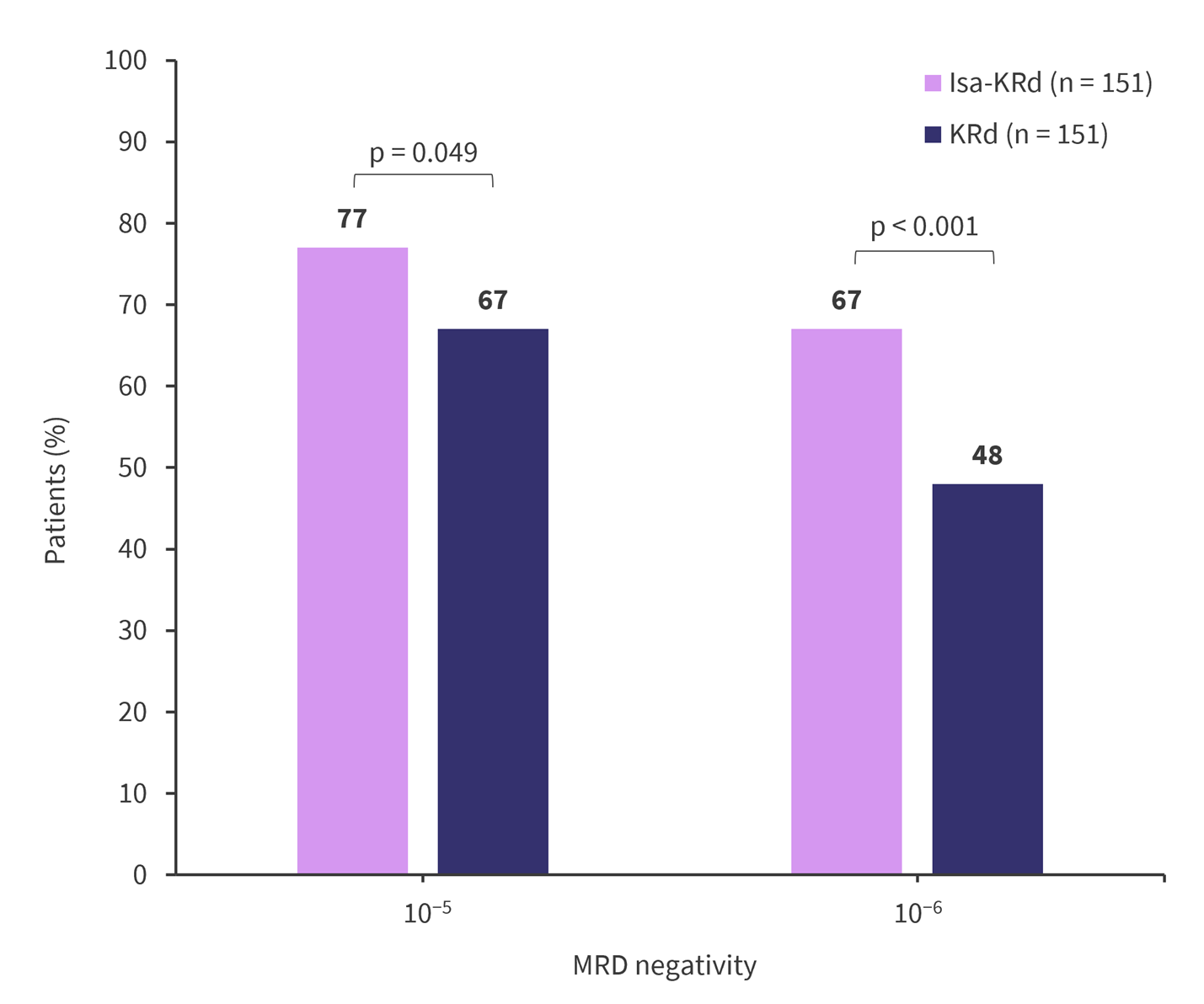 Rates of MRD negativity at 10-5 and 10-6 sensitivity had a better improvement over time in patients treated with Isa-KRd vs patients treated with KRd (Figure 3)