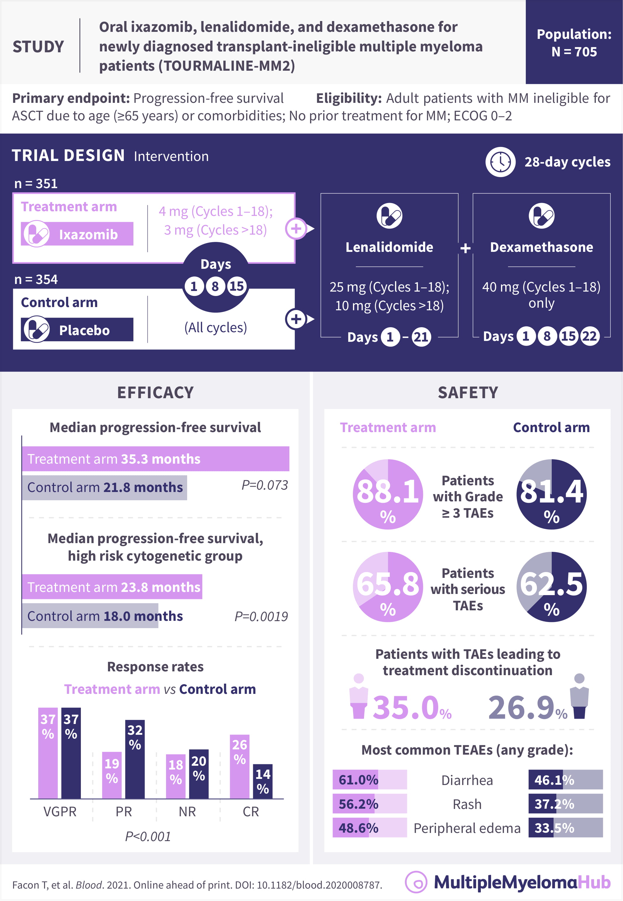 In a recent article in Blood, Thierry Facon and colleagues discussed the results of the Tourmaline-MM2 trial (NCT01850524), which tested the triplet combination of ixazomib-Rd against placebo-Rd in transplant-ineligible patients with NDMM.1