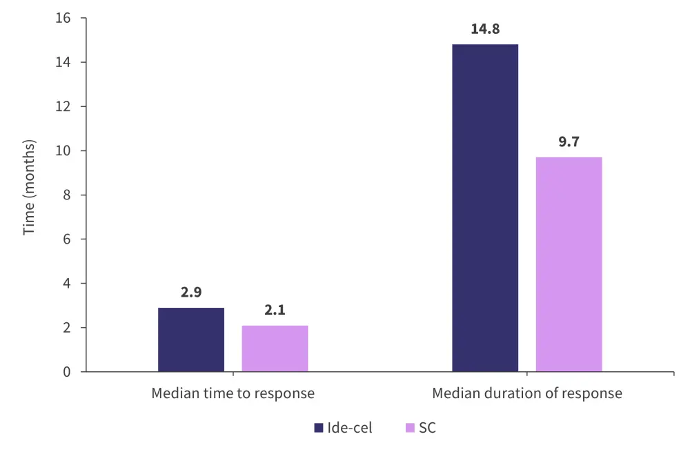 Response rates were also significantly higher for ide-cel treatment, with 71% of patients achieving an overall response rate compared with 42% in the SC group (95% CI, 2.24–5.39; p < 0.0001). Moreover, the complete response (CR) rate was 39% for ide-cel as compared with 5% for the SC group. The median time to response was similar in both treatment groups whilst the median duration of response was longer in the ide-cel group (Figure 2).