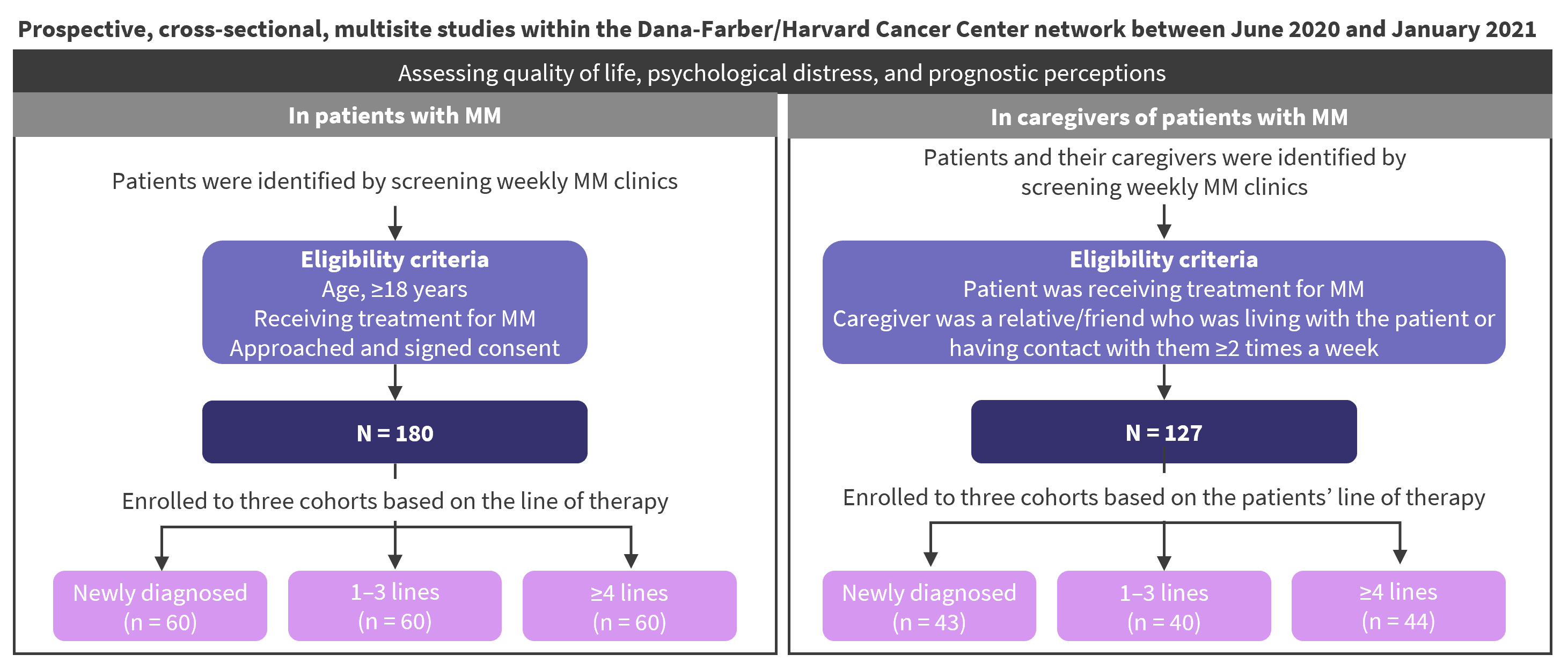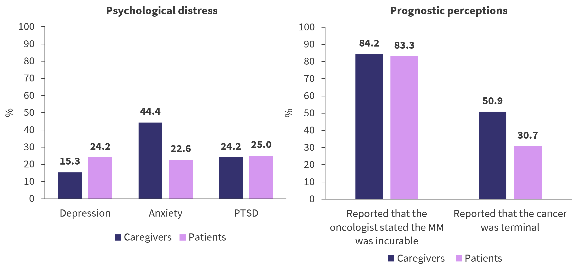 The results of both studies suggest that while there are common themes in the psychological challenges and prognostic understanding of patients with MM and their caregivers, some fundamental differences exist. Caregivers were more prone to anxiety than patients with MM, compared to depression being more common in patients. Caregivers were also more likely to acknowledge the disease was incurable as it progressed.