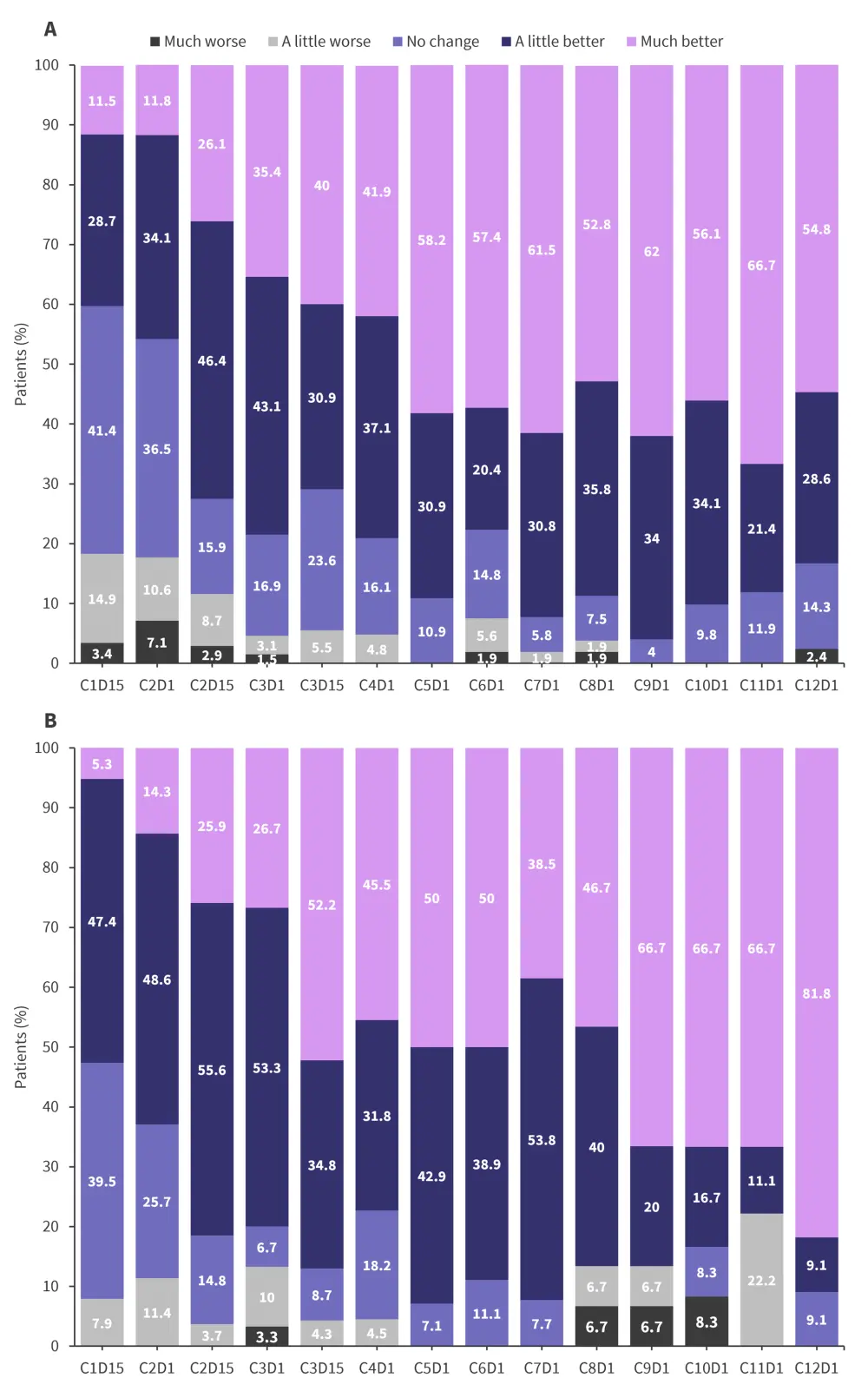 Figure 1. Change in symptoms reported in A BCMA-naïve and B BCMA-exposed patients treated with elranatamab over time*