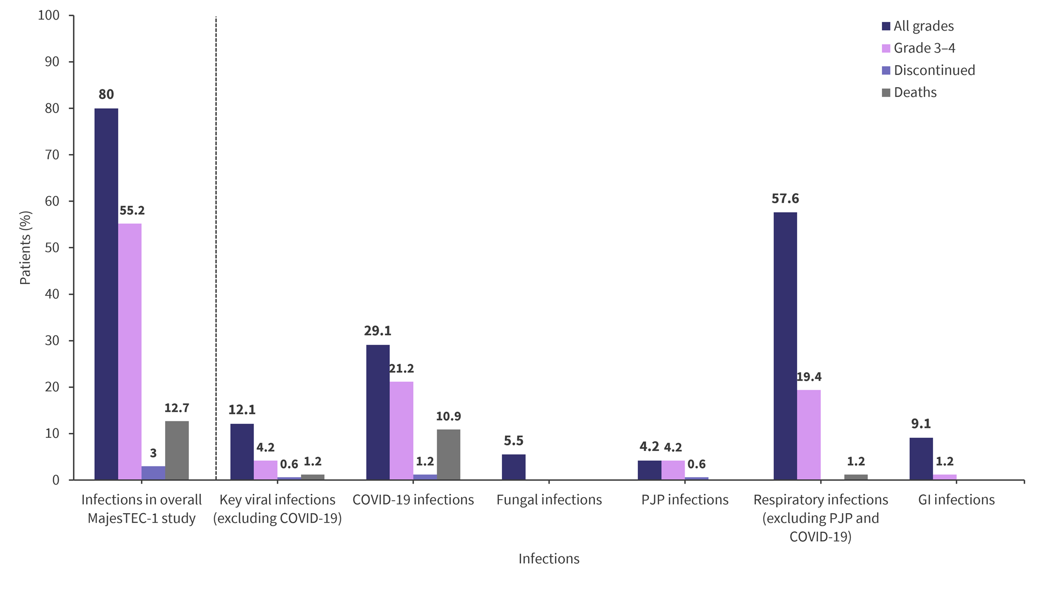 Overall, infections were reported in 80% of patients, including opportunistic infections in 9.1% of patients. Figure 1 shows the incidence of overall infections, including Grade 3–4 infections.