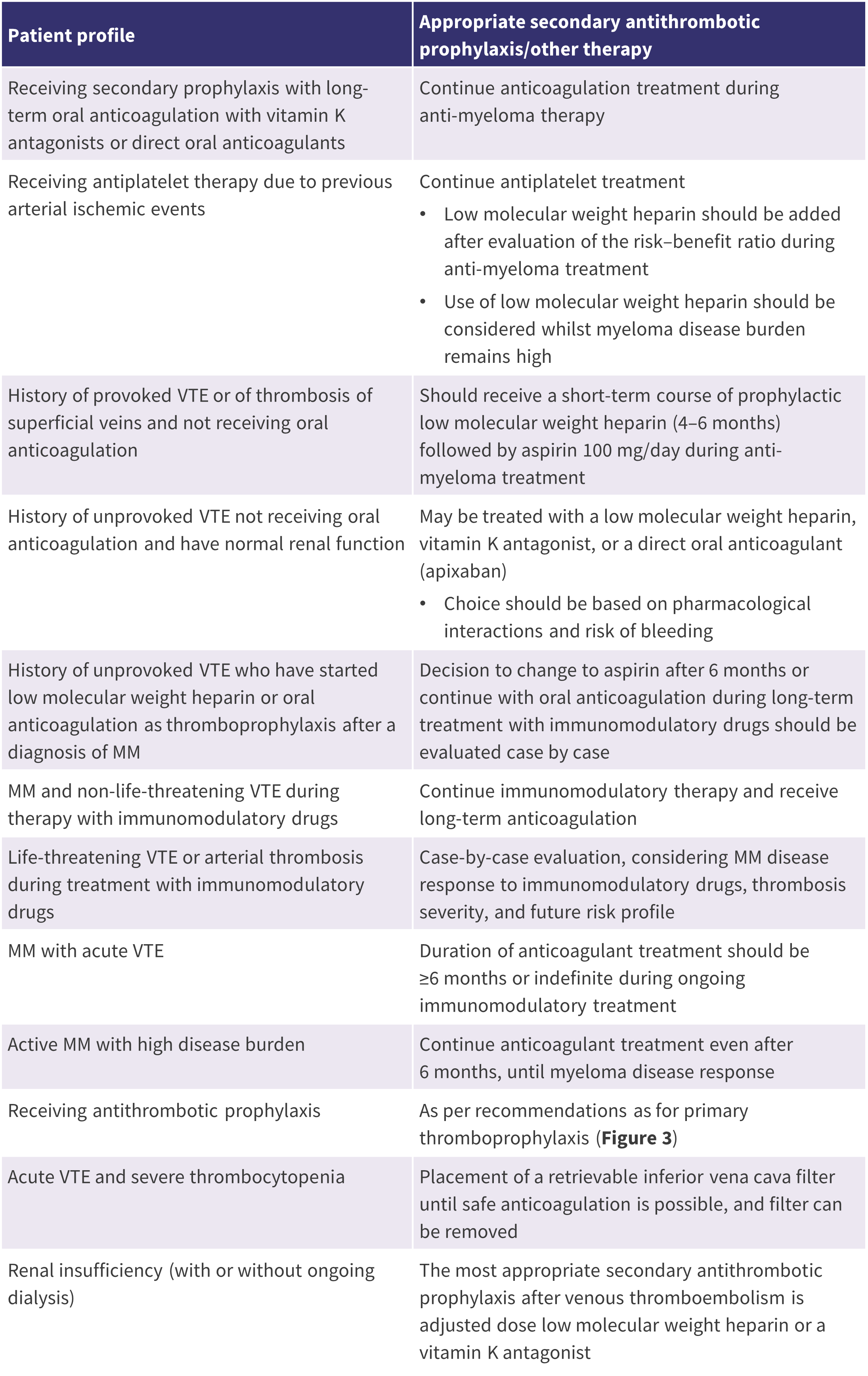 In general, acute thrombosis treatment during active MM treatment should not differ from standard recommendations. Considerations for determining appropriate secondary antithrombotic prophylaxis in selected patient subpopulations are outlined in Figure 4.