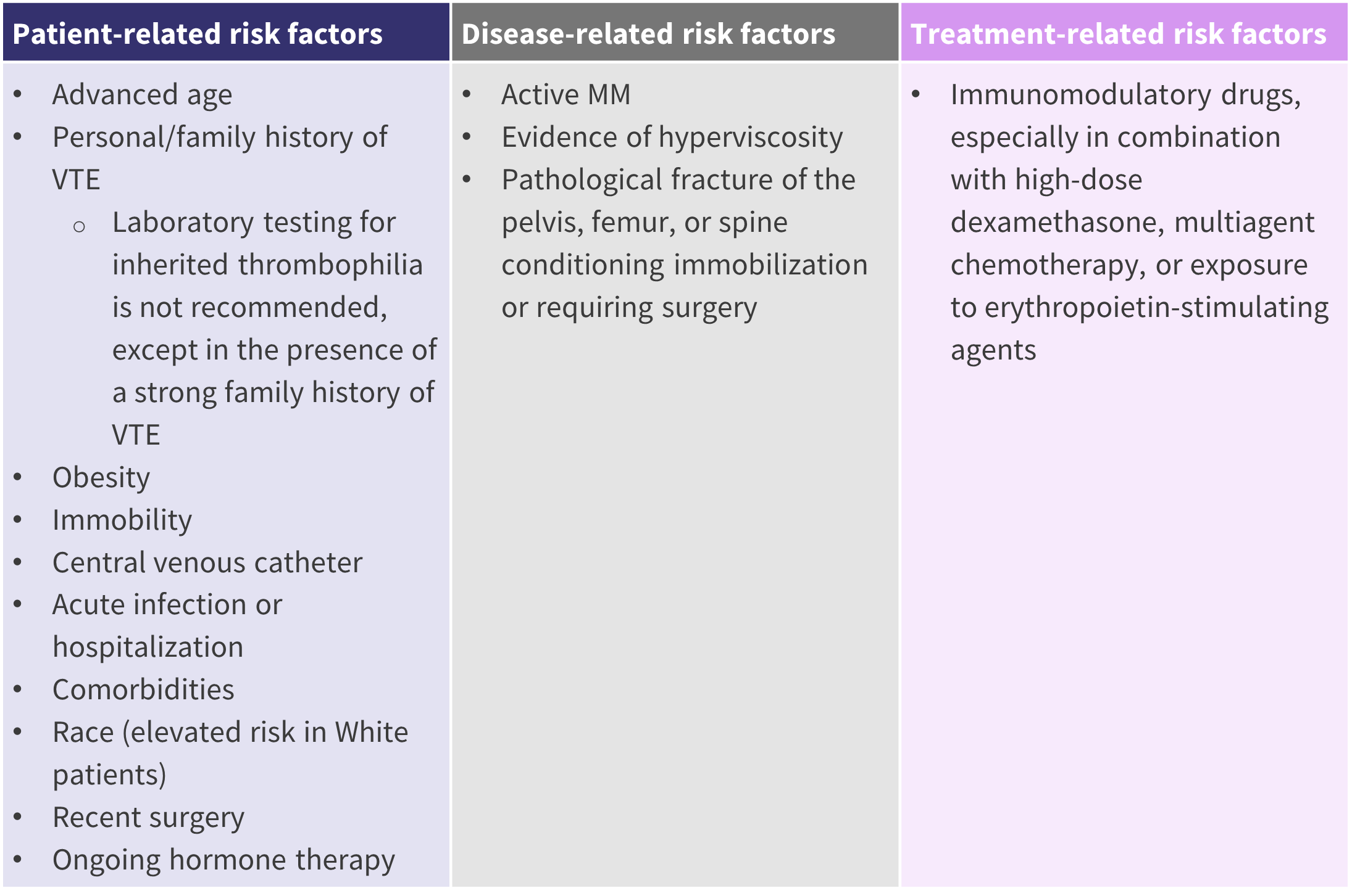 All patients with MM who are candidates for treatment require a thrombosis risk evaluation to prevent thromboembolic complications. Evaluations should include patient, disease, and treatment-related risk factors (Figure 1).