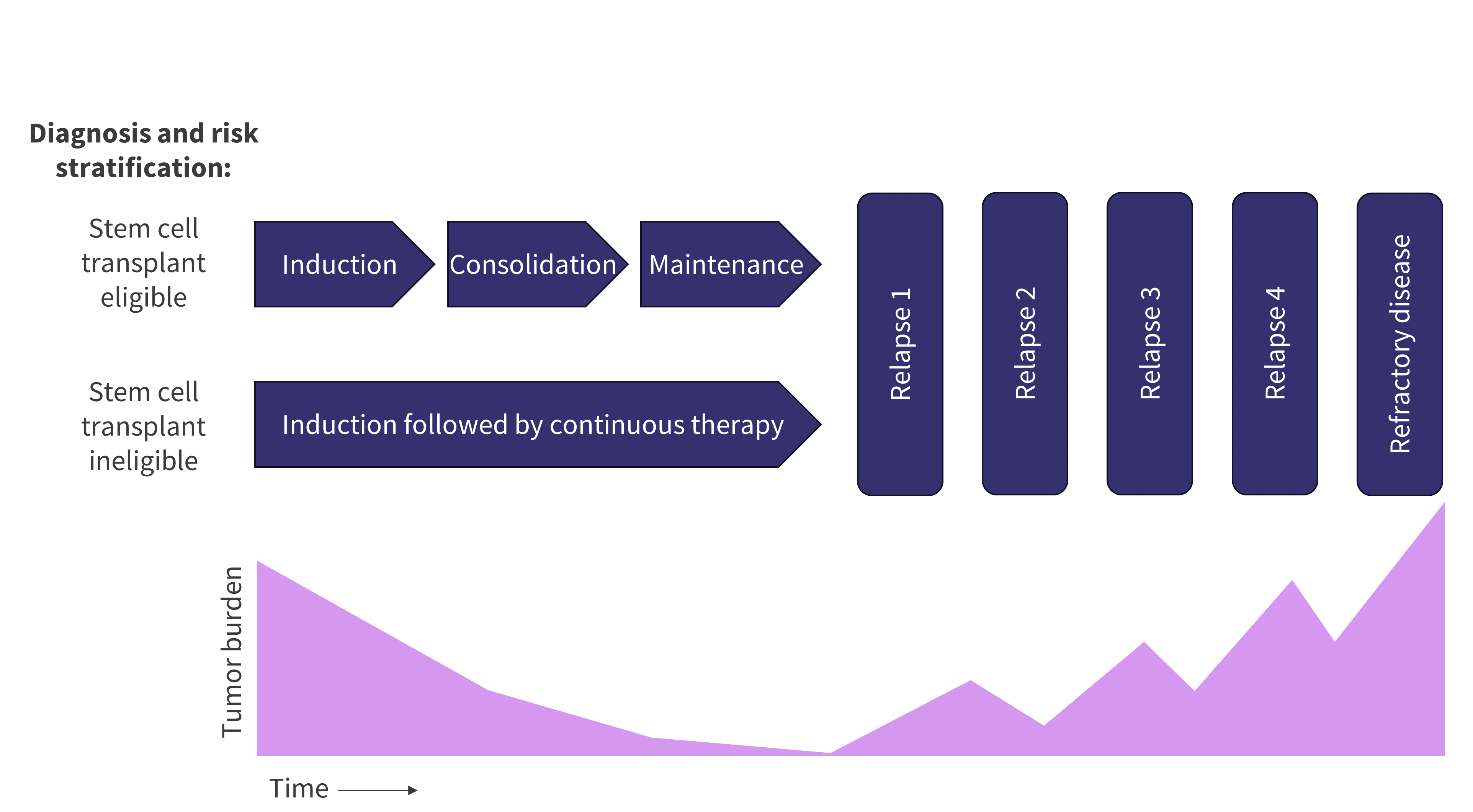 The only potentially curative treatment for MM is stem cell transplantation; thus, the MM treatment paradigm is differentiated by transplant eligibility. A summary of the current treatment paradigm is shown in Figure 4.