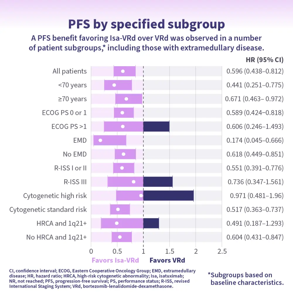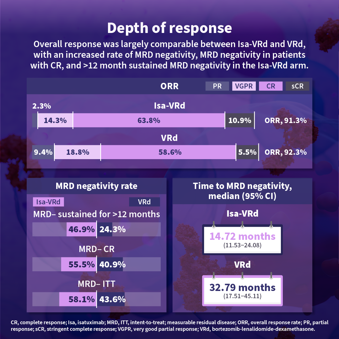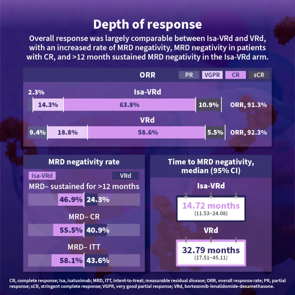 The primary endpoint of progression-free survival was met, demonstrating a 40.4% reduction in the risk of progression or death with Isatuximab in combination with bortezomib, lenalidomide, and dexamethasone in patients with transplant-ineligible newly diagnosed multiple myeloma.