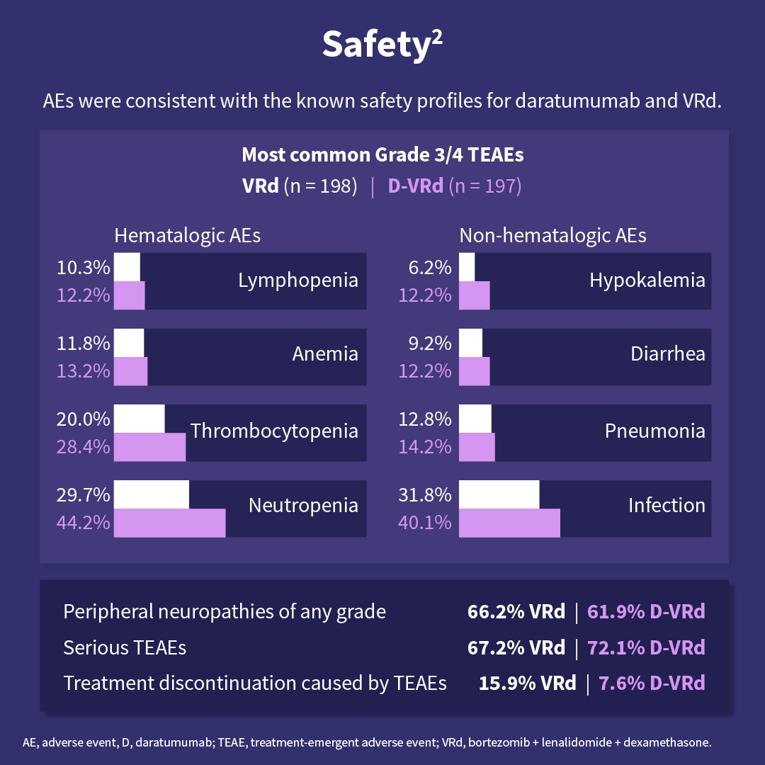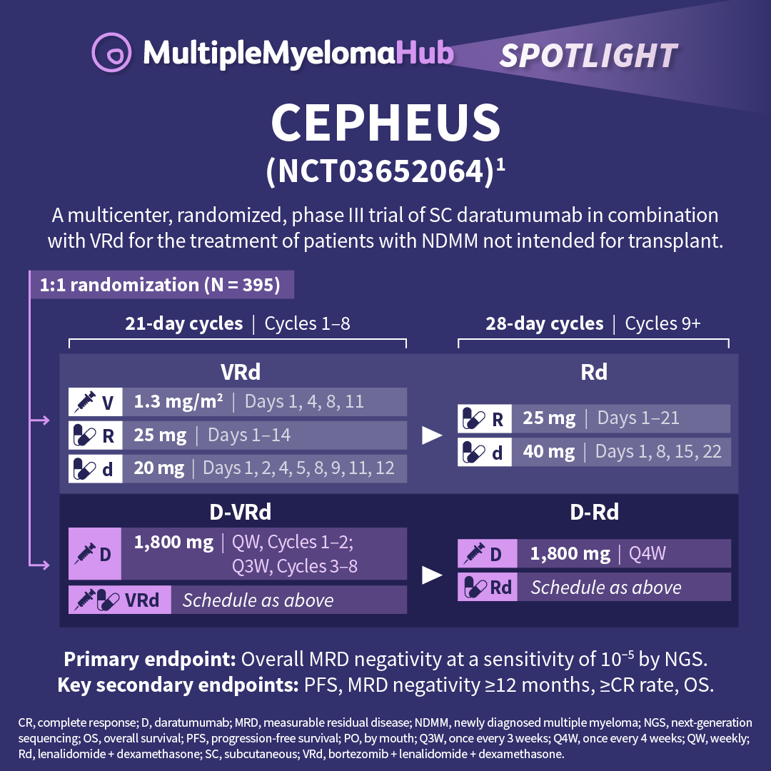 The latest data from the phase III CEPHEUS trial (NCT03652064) were published in Nature Medicine by Saad Usmani et al., highlighting the benefit of the addition of daratumumab (D) to the standard-of-care bortezomib–lenalidomide–dexamethasone (VRd) regimen for patients with newly diagnosed multiple myeloma, where transplant is not intended as an initial therapy.