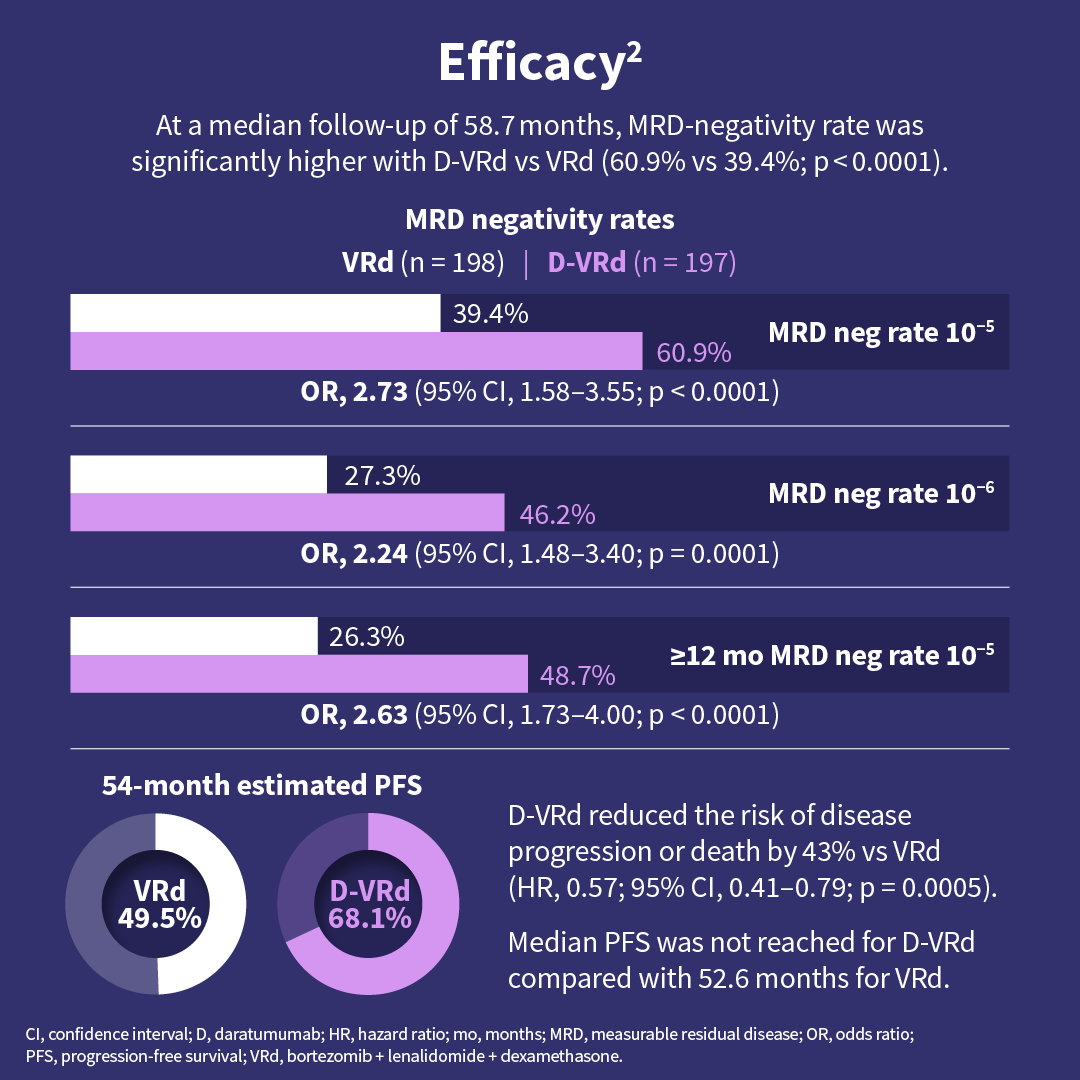 The primary endpoint was measurable residual disease (MRD) negativity at a sensitivity of ×10-5, which was significantly higher with D-VRd vs VRd. The quadruplet regimen also improved outcomes vs VRd across key secondary endpoints including sustained MRD negativity, complete response, and progression-free survival.